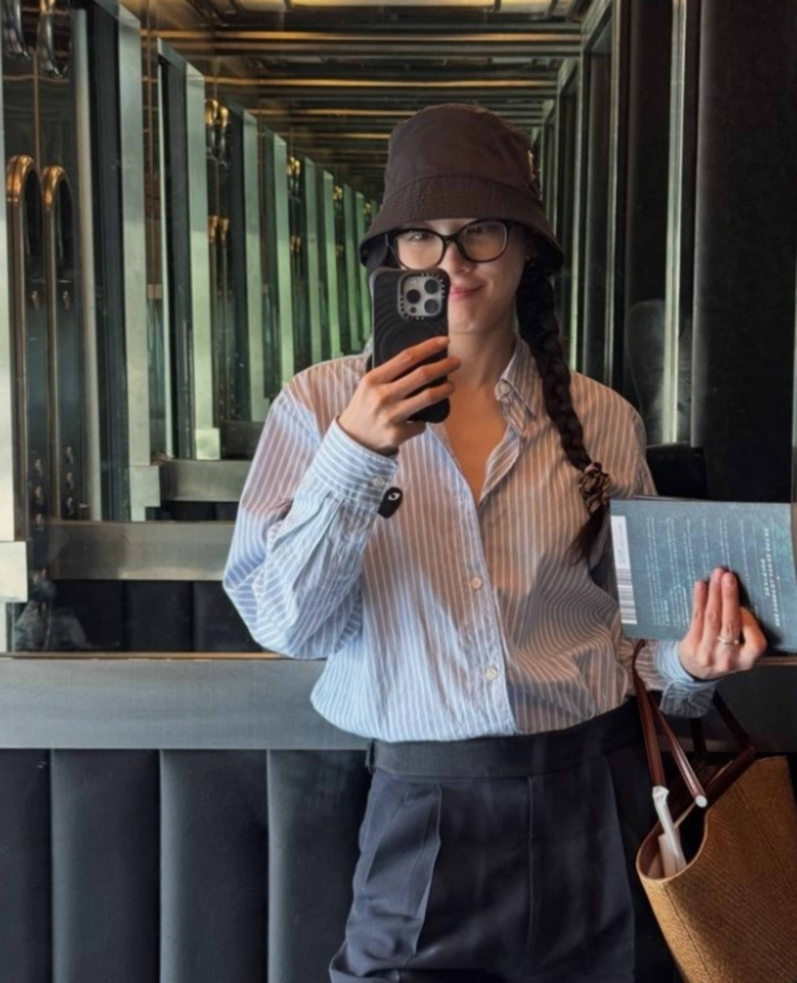 일본 브랜드인 꼼데가르송 스트라이프 셔츠 그리고 블랙 컬러의 테일러스 슬랙스, 블랙 그레이 컬러의 버킷햇과 브라운 색상의 핸드백까지 가벼운 외출룩을 선보였는데요.