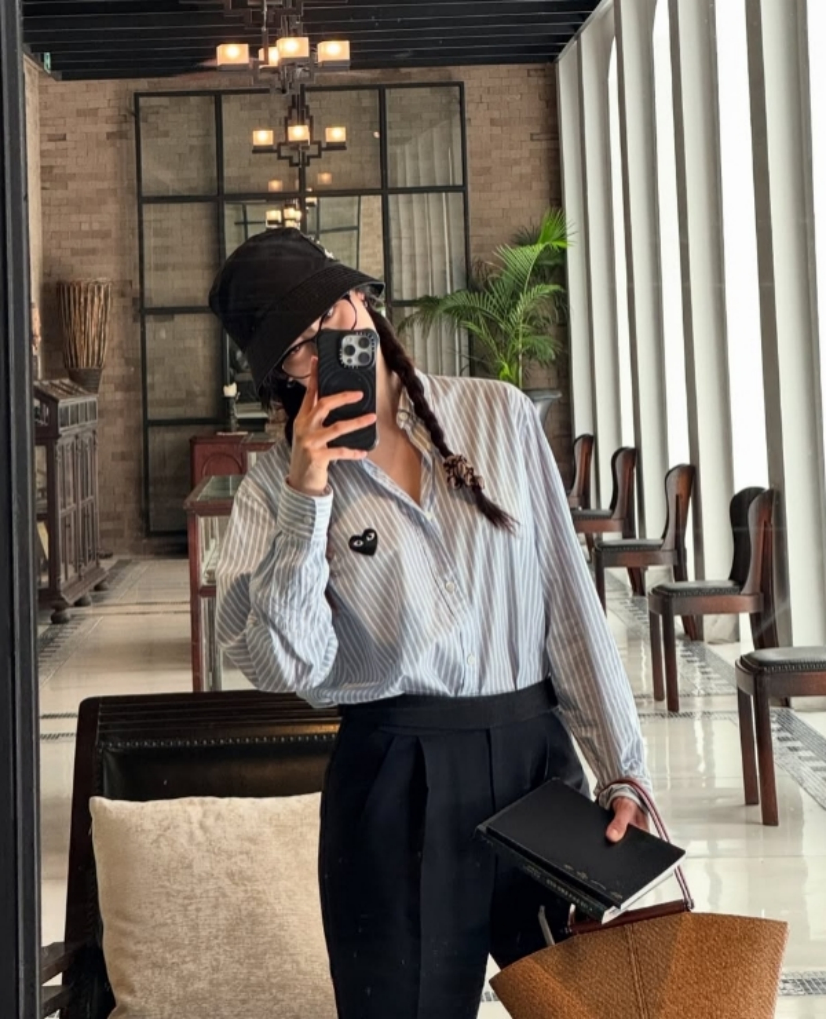 일본 브랜드인 꼼데가르송 스트라이프 셔츠 그리고 블랙 컬러의 테일러스 슬랙스, 블랙 그레이 컬러의 버킷햇과 브라운 색상의 핸드백까지 가벼운 외출룩을 선보였는데요.