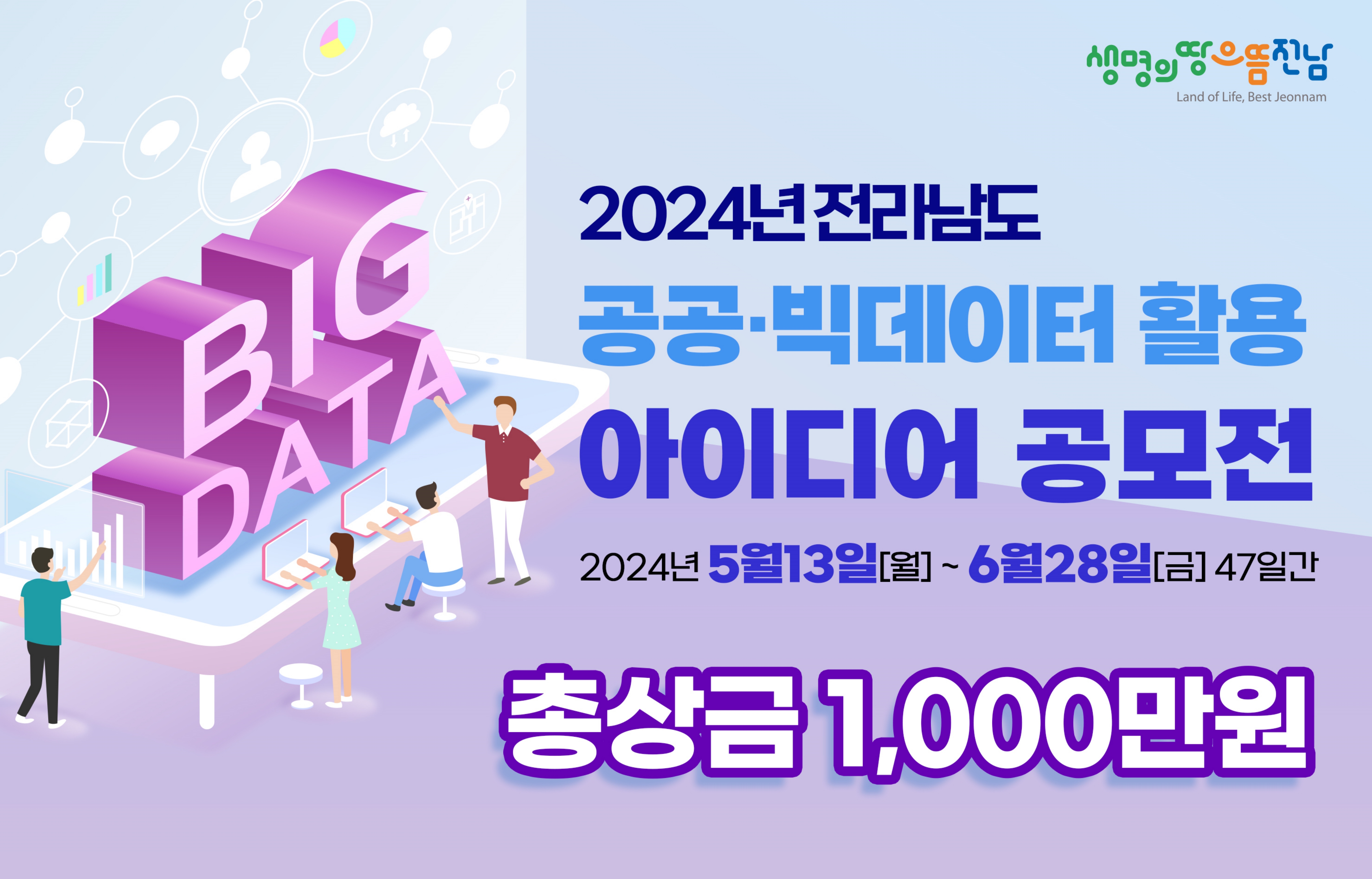 전라남도는 공공 빅데이터 활성화를 위한 창의적 아이디어와 비즈니스 모델 발굴을 위해 전남정보문화산업진흥원과 함께 2024년 전라남도 공공 빅데이터 활용 아이디어 공모전’을 개최한다.