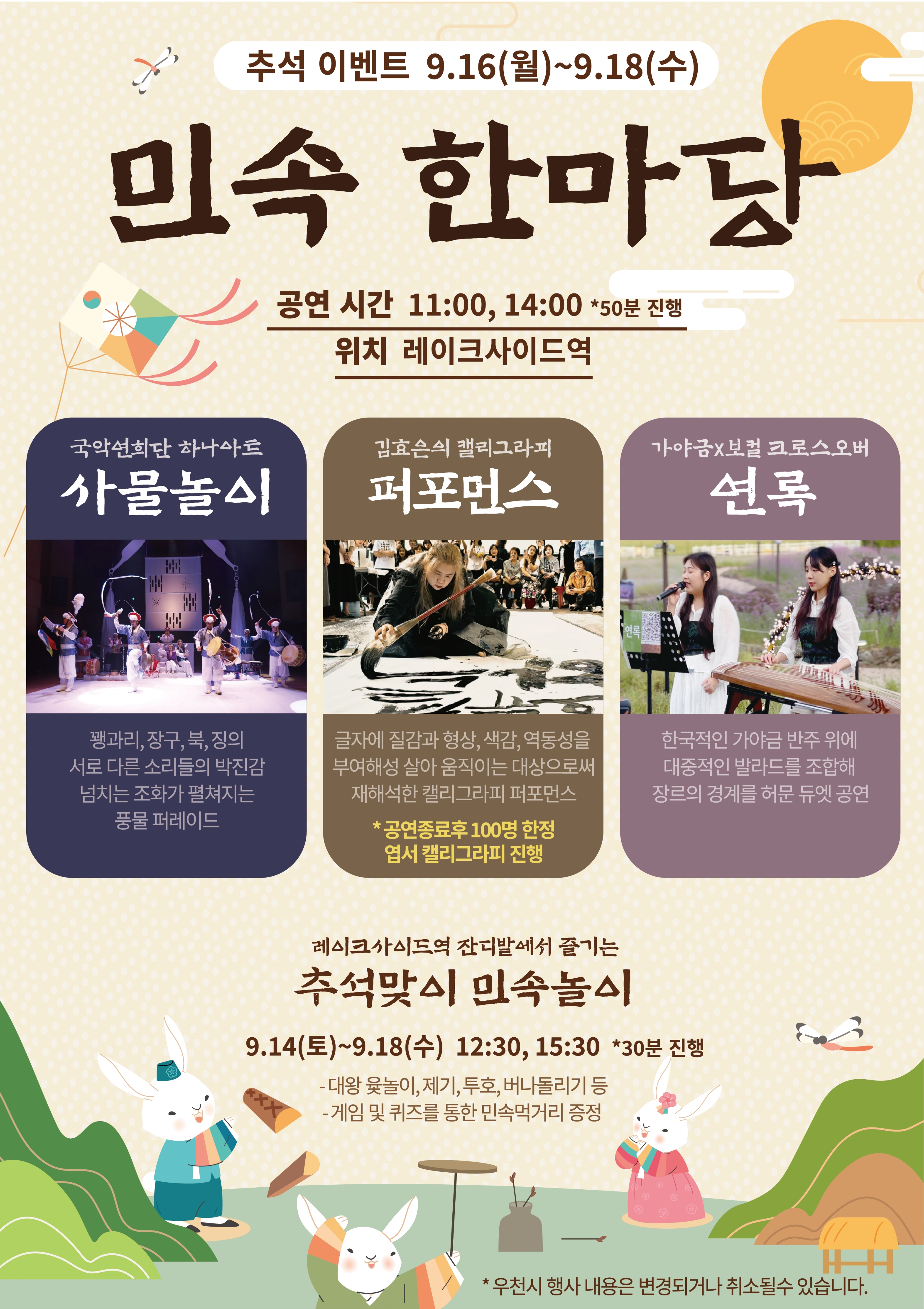 연휴가 시작되는 14일부터 연휴 마지막 날인 18일까지 한복을 입은 미녀역장의 손님맞이 포토타임(메인역 탑승구 10:00~12:00)과 레크리에이션 MC의 진행으로 대형윳놀이, 재기차기, 버나돌리기, 투호놀이 등 전통민속놀이(레이크사이드역 잔디광장 12:30, 15:30)를 진행한다.