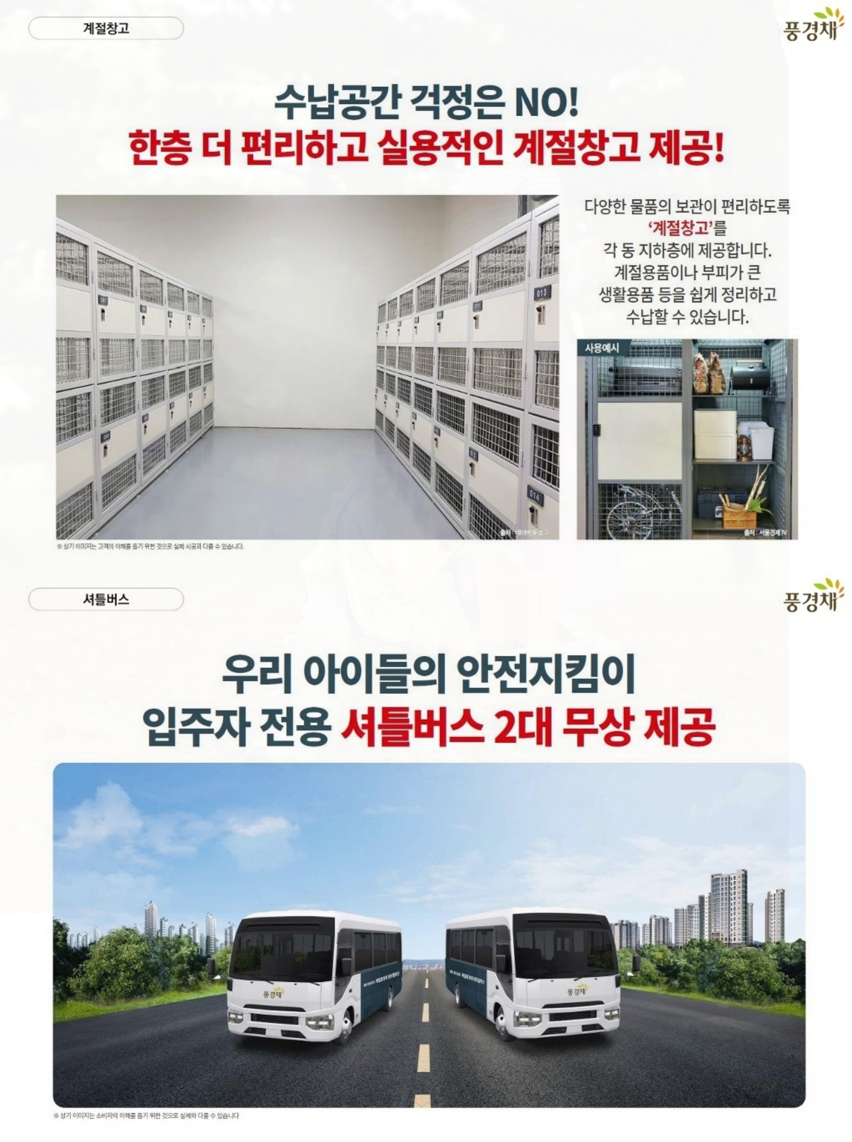 입주민들을 위한 계절창고가 지하에 배치되어 있으며, 입주자 전용 셔틀버스도 2대가 무상으로 제공됩니다.