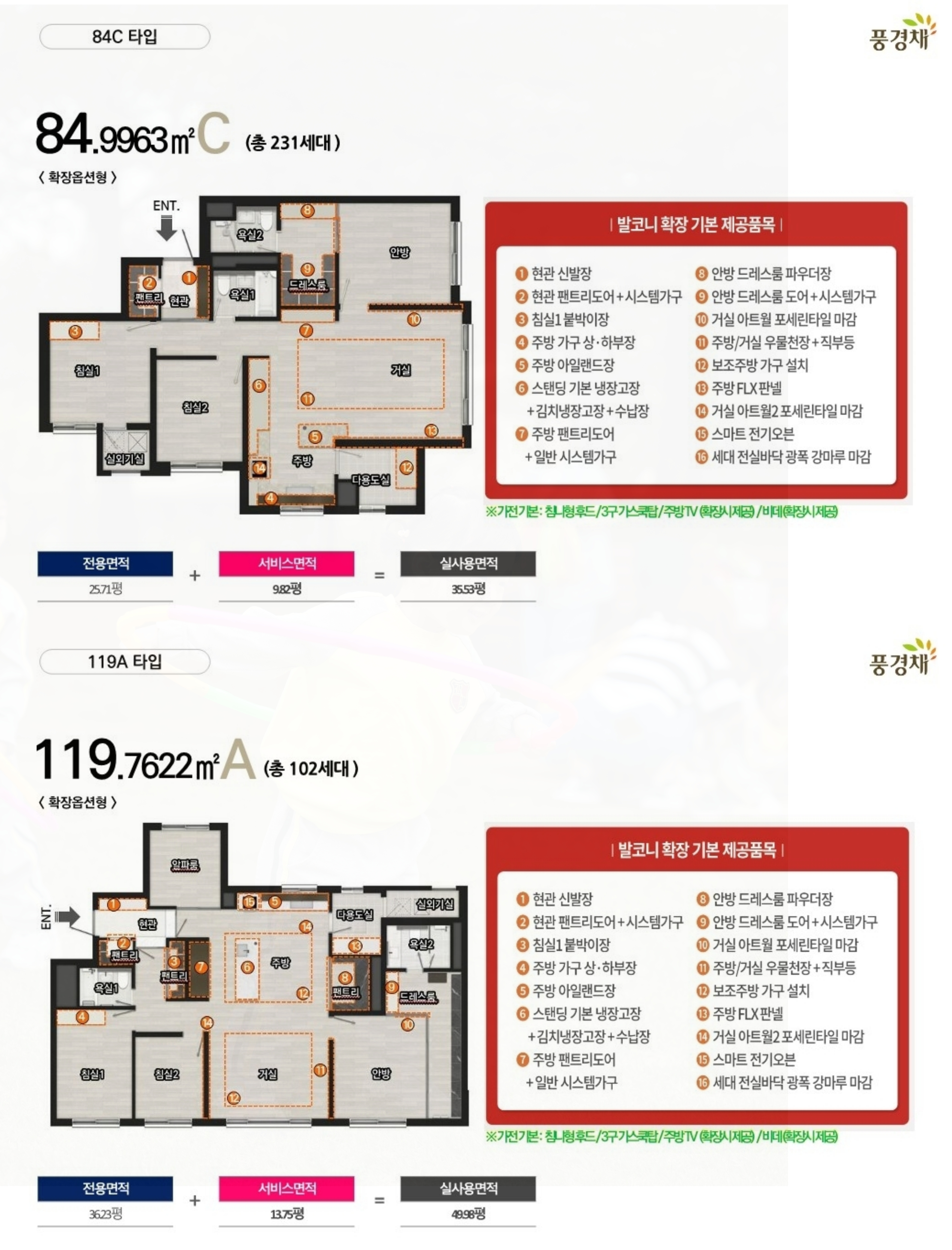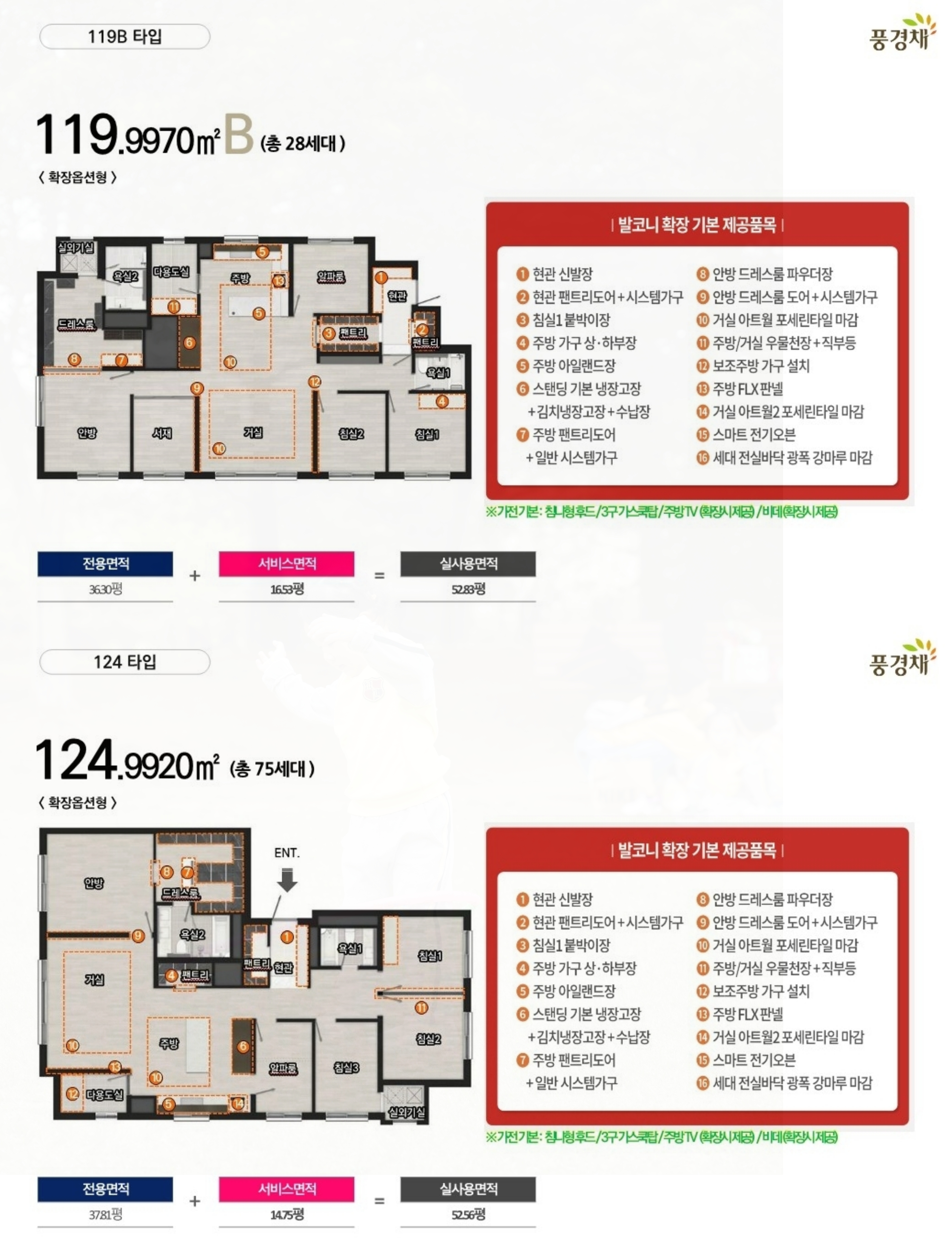 119형은 4 베이 판상형과 5 베이 판상형으로 나뉘며, 알파룸이 추가되고 주방과 다용도실 사이에 팬트리 공간이 배치되어 있습니다.