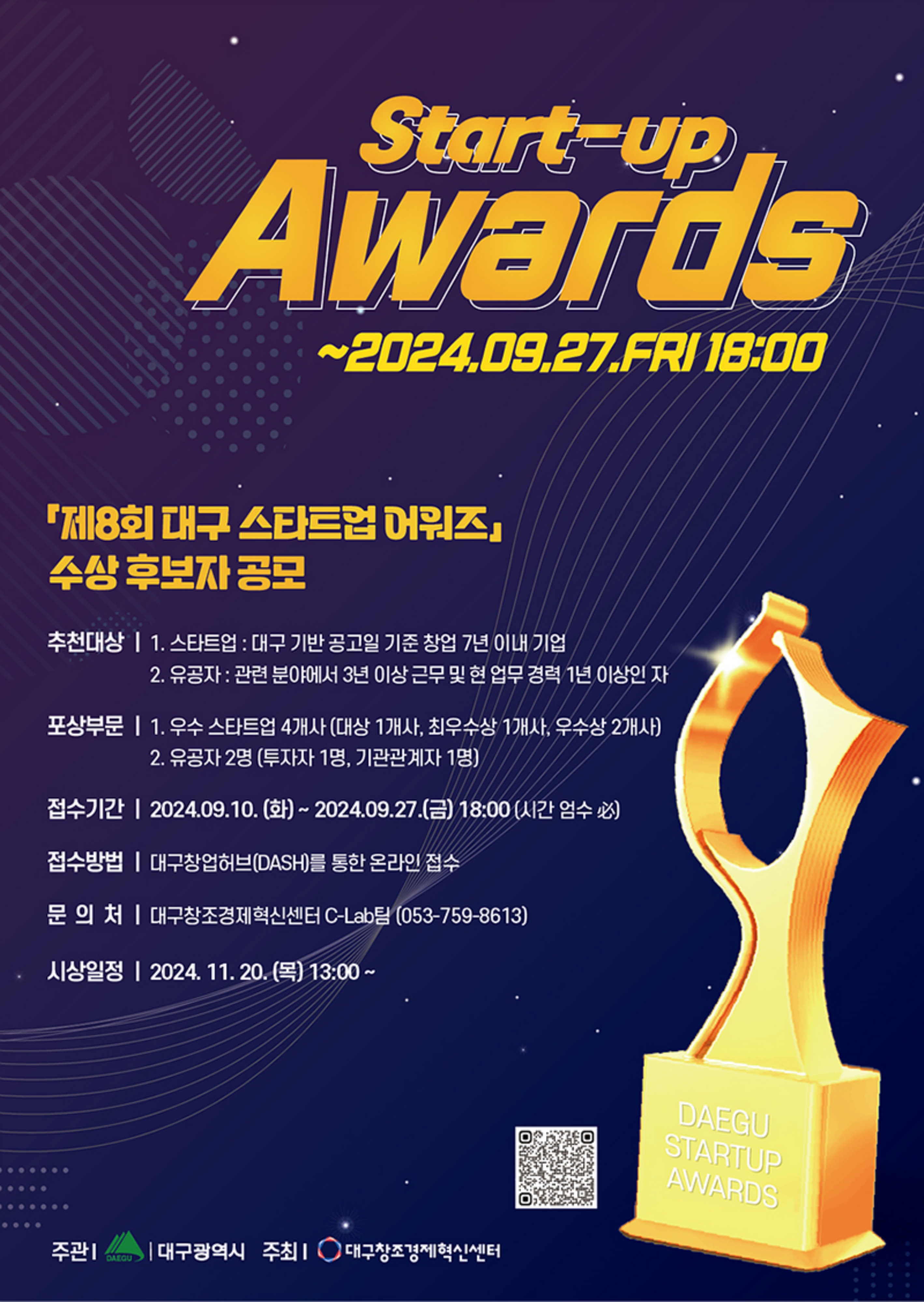 2024년 제8회 대구스타트업어워즈 수상 후보자 공모는 9월 10일(화)부터 9월 27일(금)까지 대구창업허브(DASH)사이트를 통해 접수하며, 전문가로 구성된 선정평가위원회를 통해 최종 선정된다.