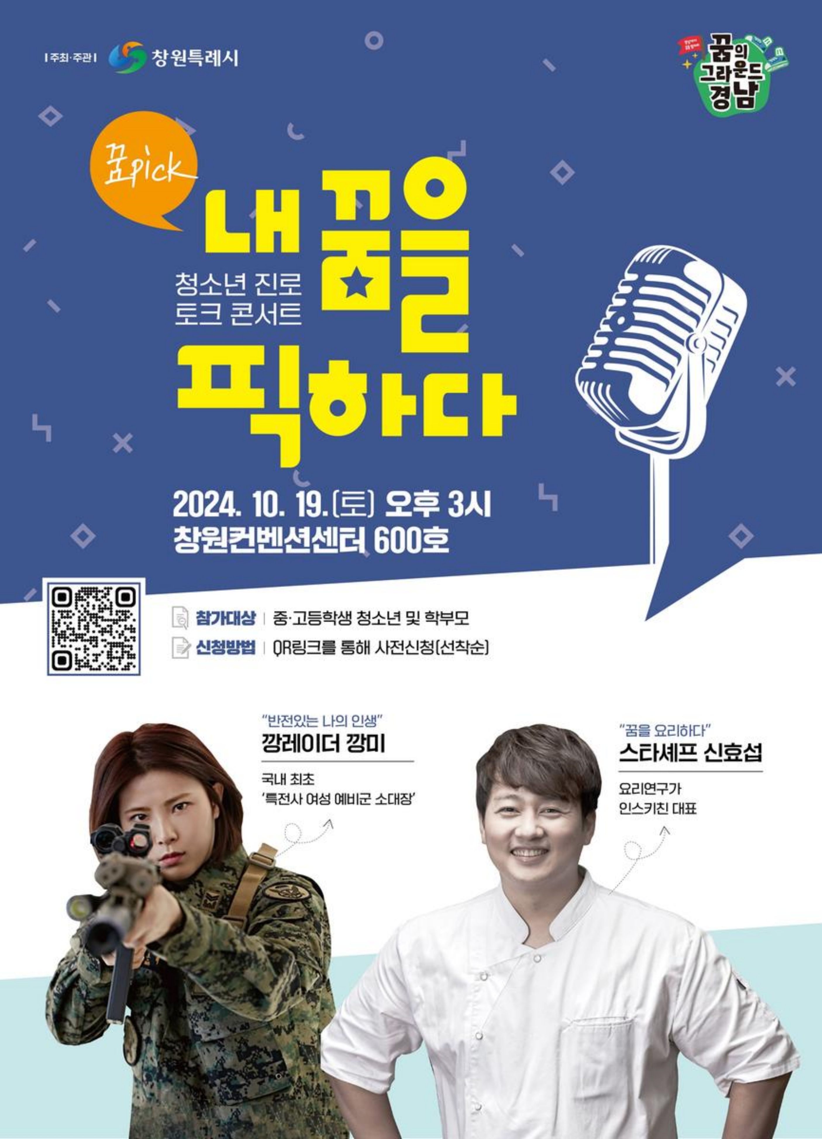 창원특례시는 19일 15시 창원컨벤션센터 600호에서 내 꿈을 픽하다(청소년 진로 토크콘서트)를 진행한다고 밝혔다.