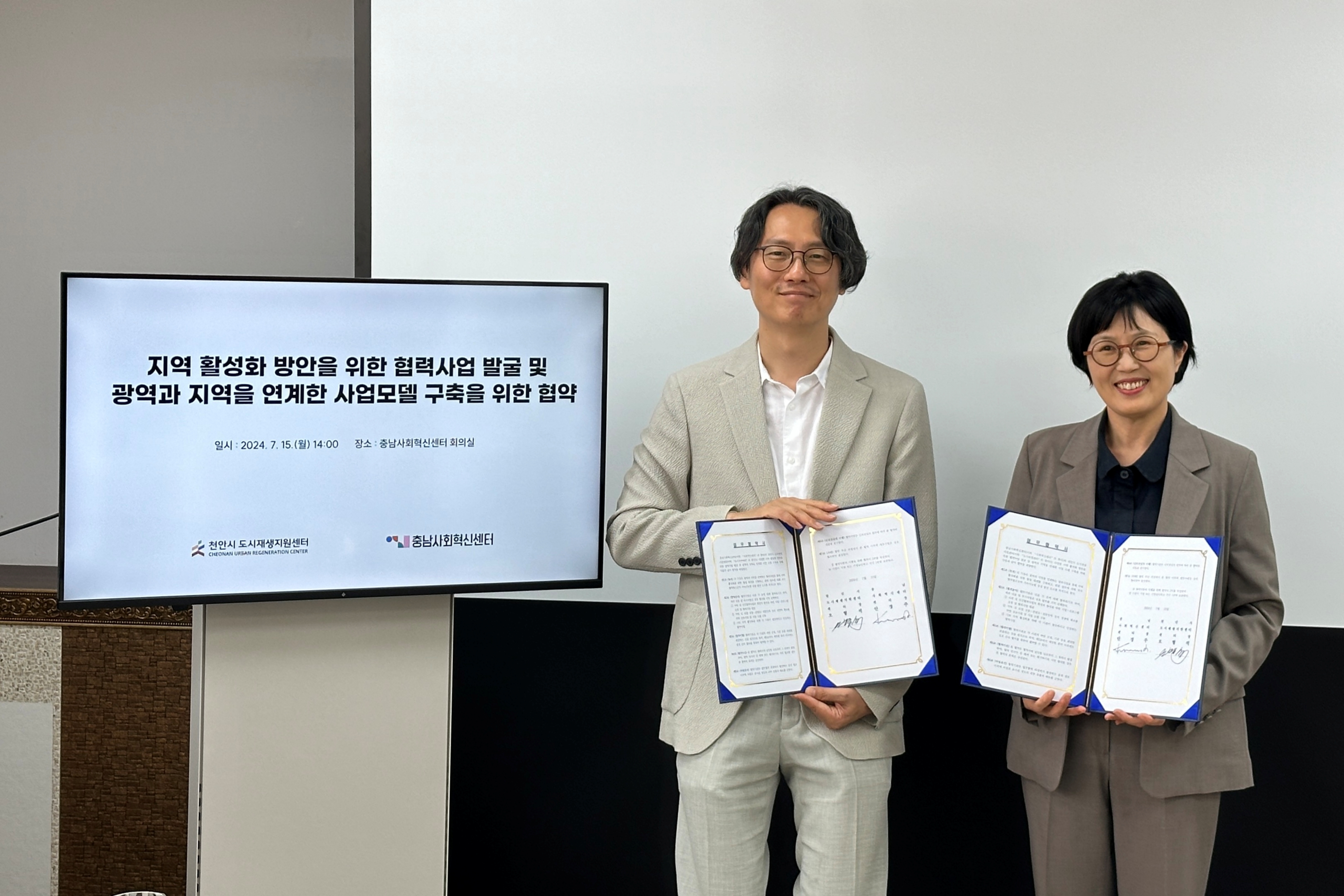 천안시 도시재생지원센터는 지난 15일 충남사회혁신센터와 지역 활성화를 위한 협력사업 발굴 및 광역과 지역을 연계한 사업 모델 구축을 위한 업무협약(MOU)을 체결했다.