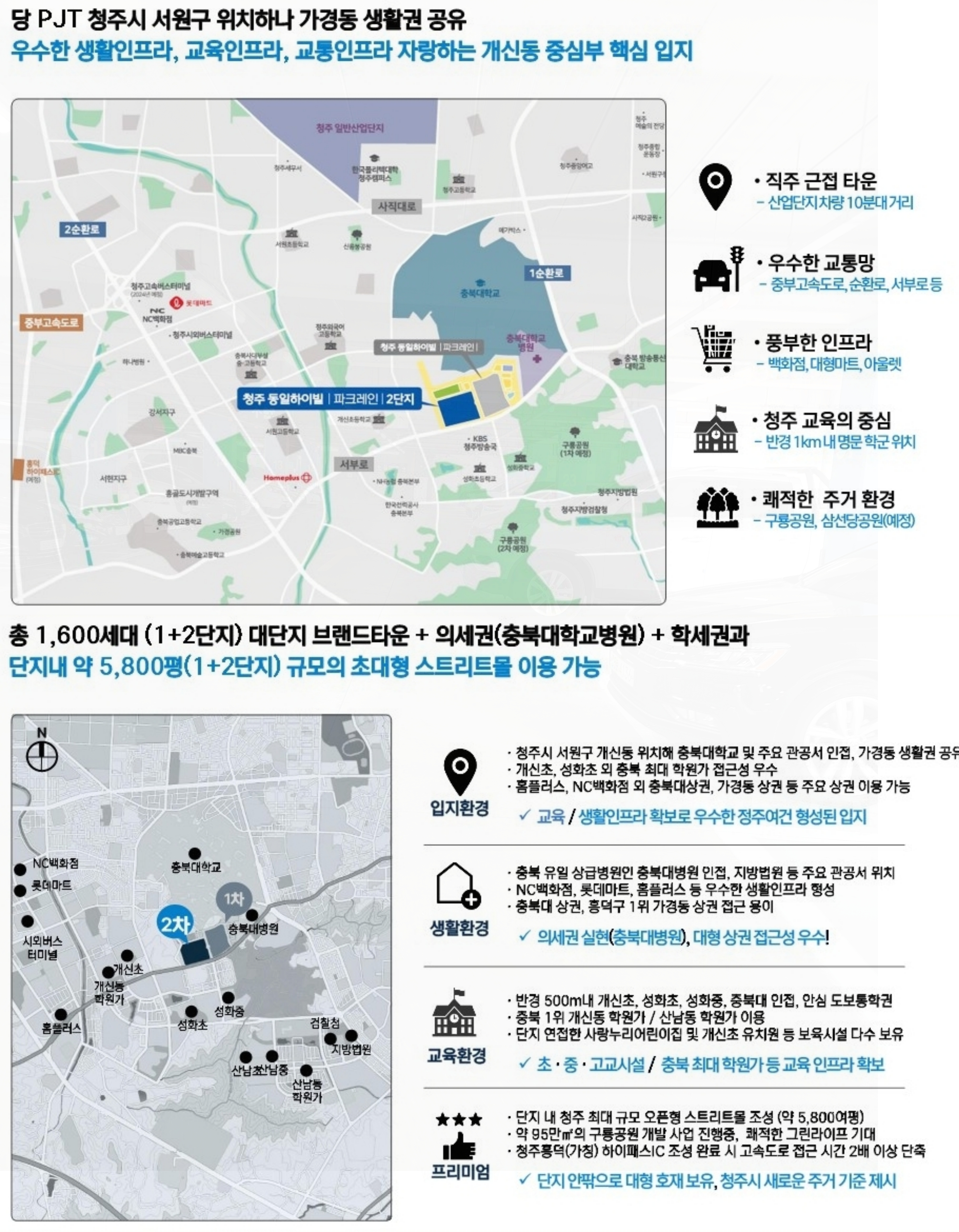 이곳 현장 주변은 국립 충북대학교와 상급 병원인 충대병원, 개신 배수지 체육공원의 청정 힐링 숲세권, 개신동 송악삼입과 개신 삼익 주변의 생활 밀접 업종들이 다수 입점하여 주민 편의성을 높일 것으로 예상되며, 무엇보다 산남동 법원 및 검찰청, 아이들 학원가 플러스 성화동등 인프라는 현재도 매우 우수하다고 평가 받고 있답니다.