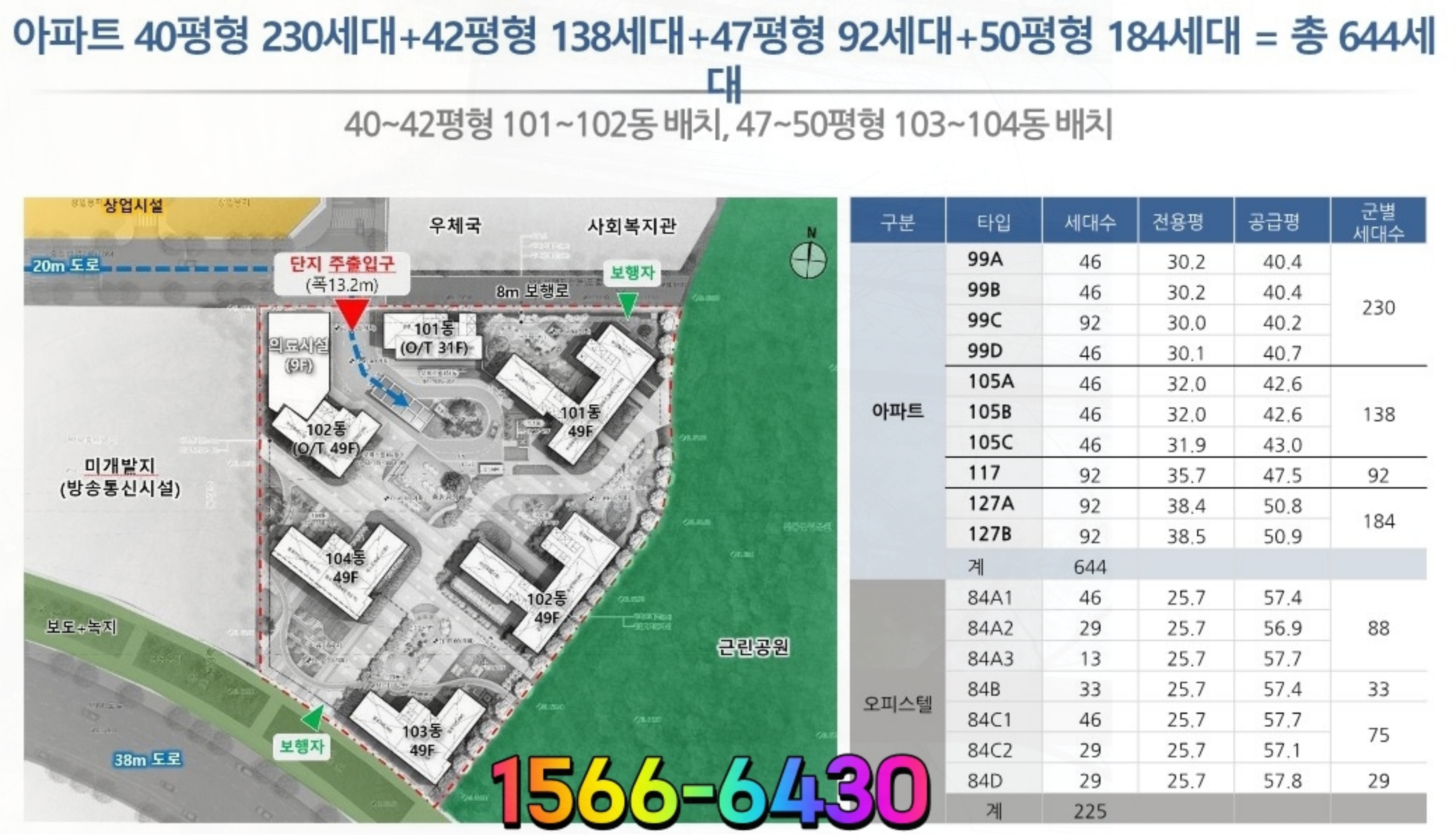 아파트 644세대 , 주거형 오피스텔 225실 의료시설과 상업시설로 단지의 용도가 설계되어 있답니다.