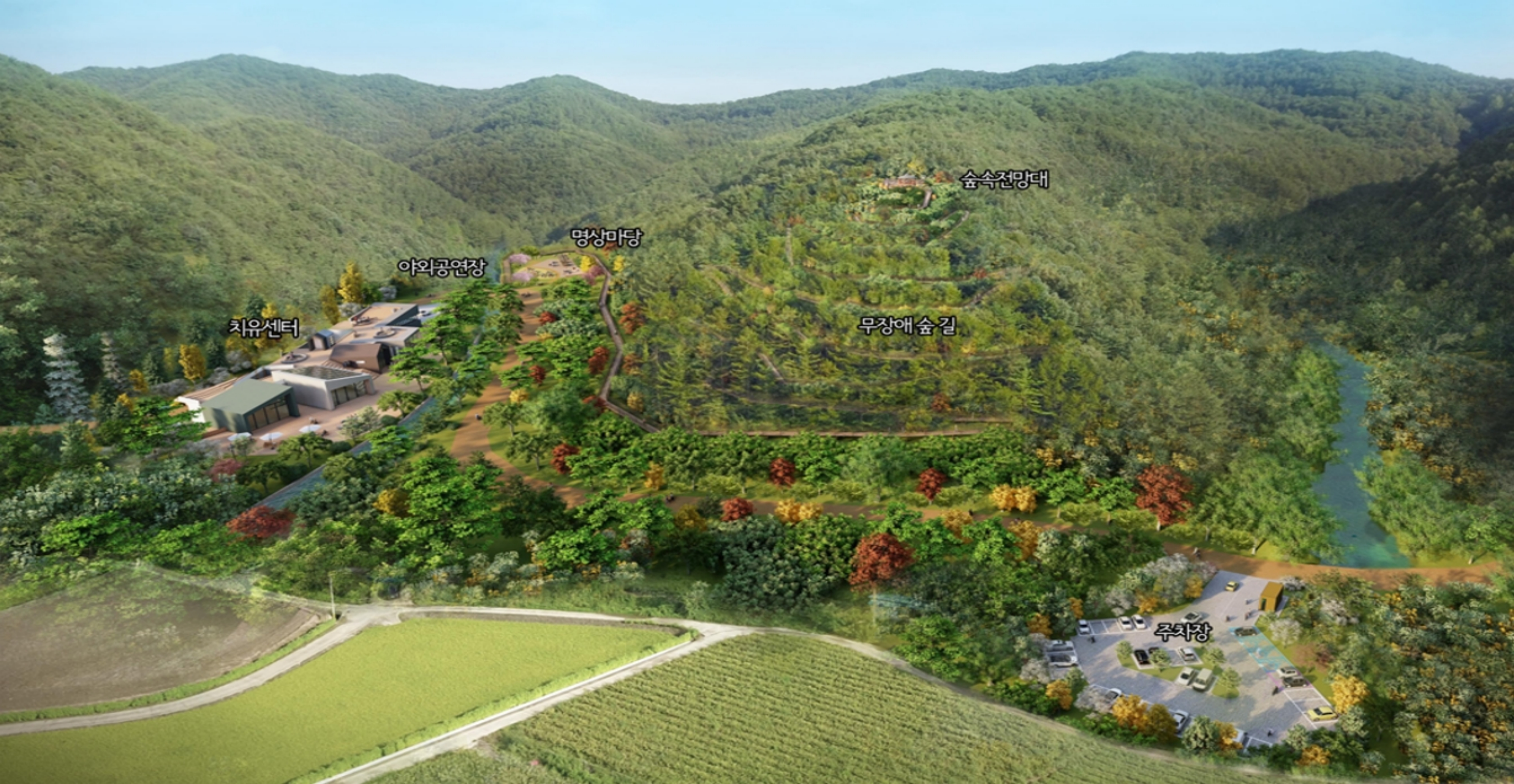 치유센터, 치유숲길, 데크로드길, 숲체험장 등 숲의 치유적 가치를 극대화할 수 있는 인프라를 구축할 계획이다.