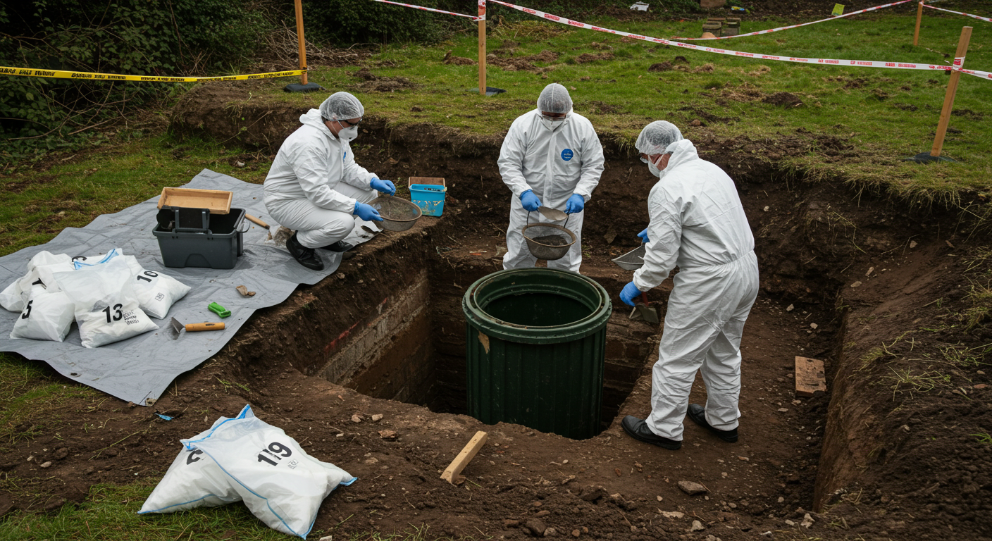 그녀는 정화조에서 사람의 해골과 뼛조각, 그리고 남편이 즐겨 입던 셔츠를 발견하고 경악했습니다.