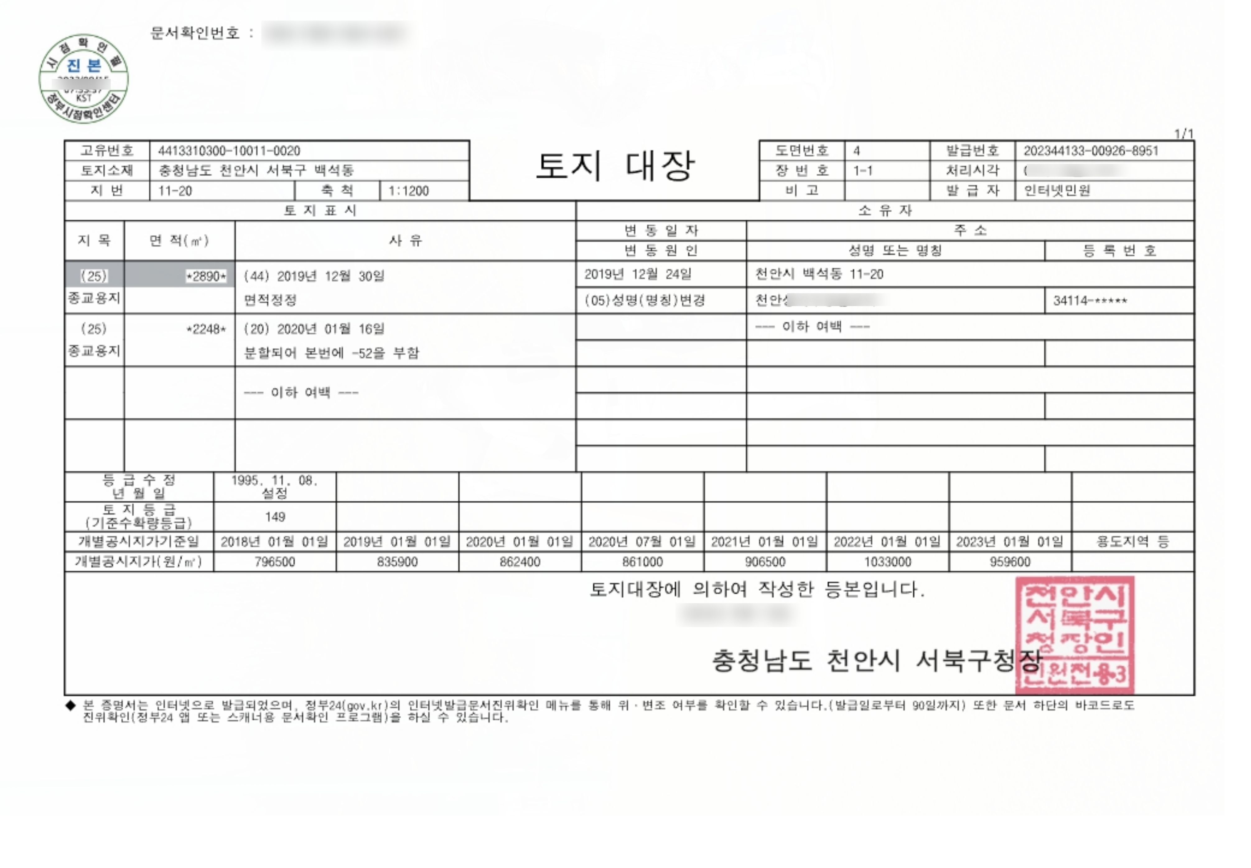 땅의 지목과 면적 그리고 변동 사유 및 일자 소유자, 개별공시지가 등등 위에서 말씀드렸던 정보들이 하나둘 확인해 보실 수 있답니다.