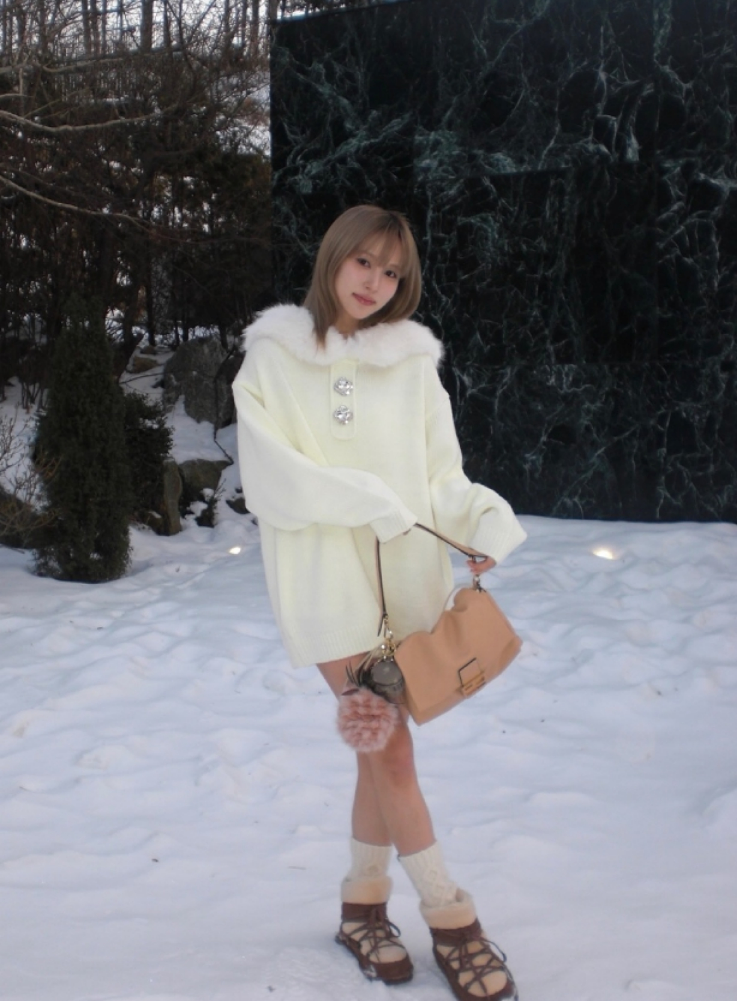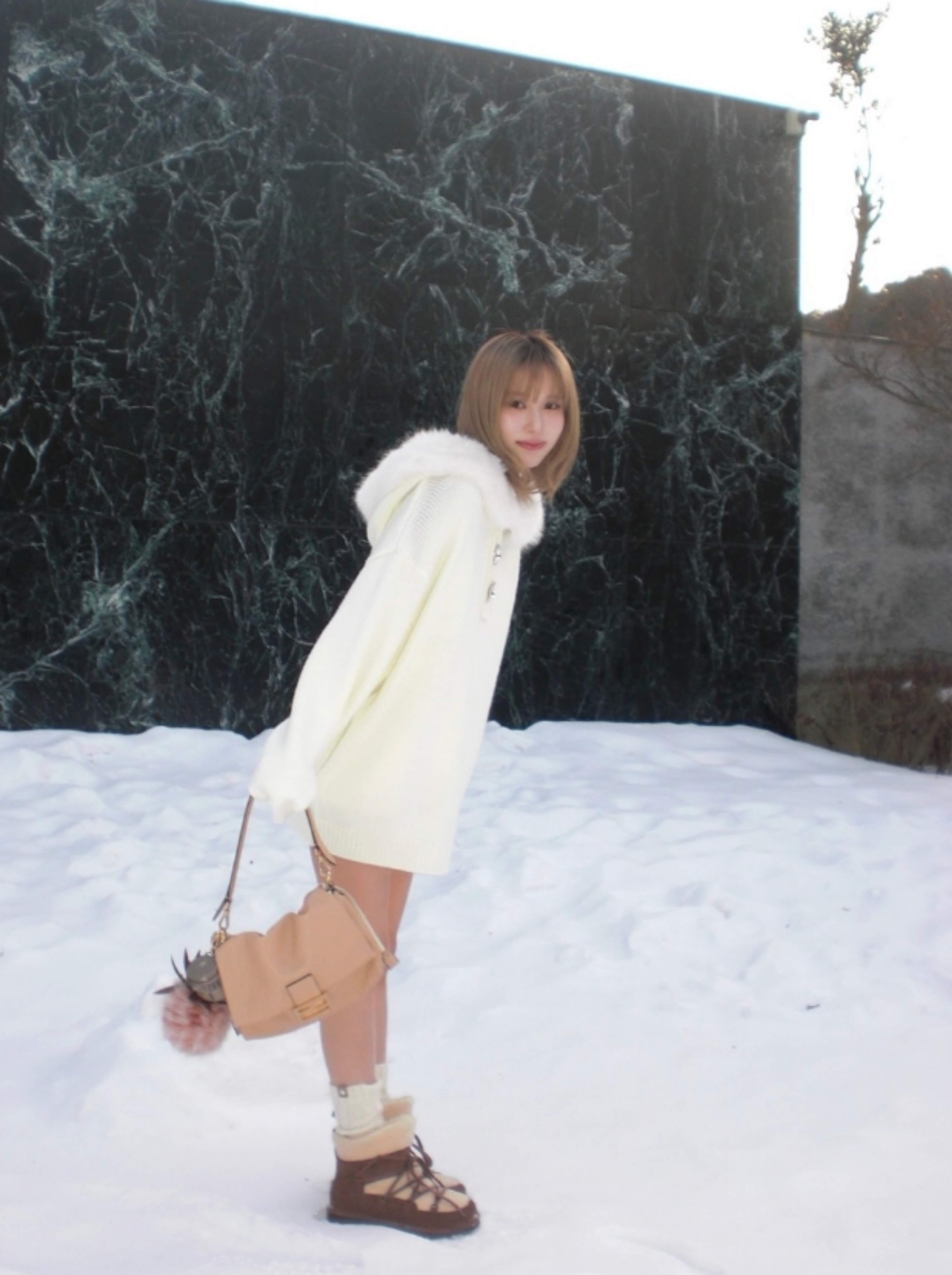 이제 따사로운 봄이 다가왔지만 트와이스 미나는 겨울에 차가운 느낌의 배경에서 찍은 느낌이라 무언가 조화가 잘 안 될 것 같지만... 상큼한 미소와 함께 손에 들고 있는 포즈는 사뭇 겨울잠에서 깬 미녀의 모습이랄까?