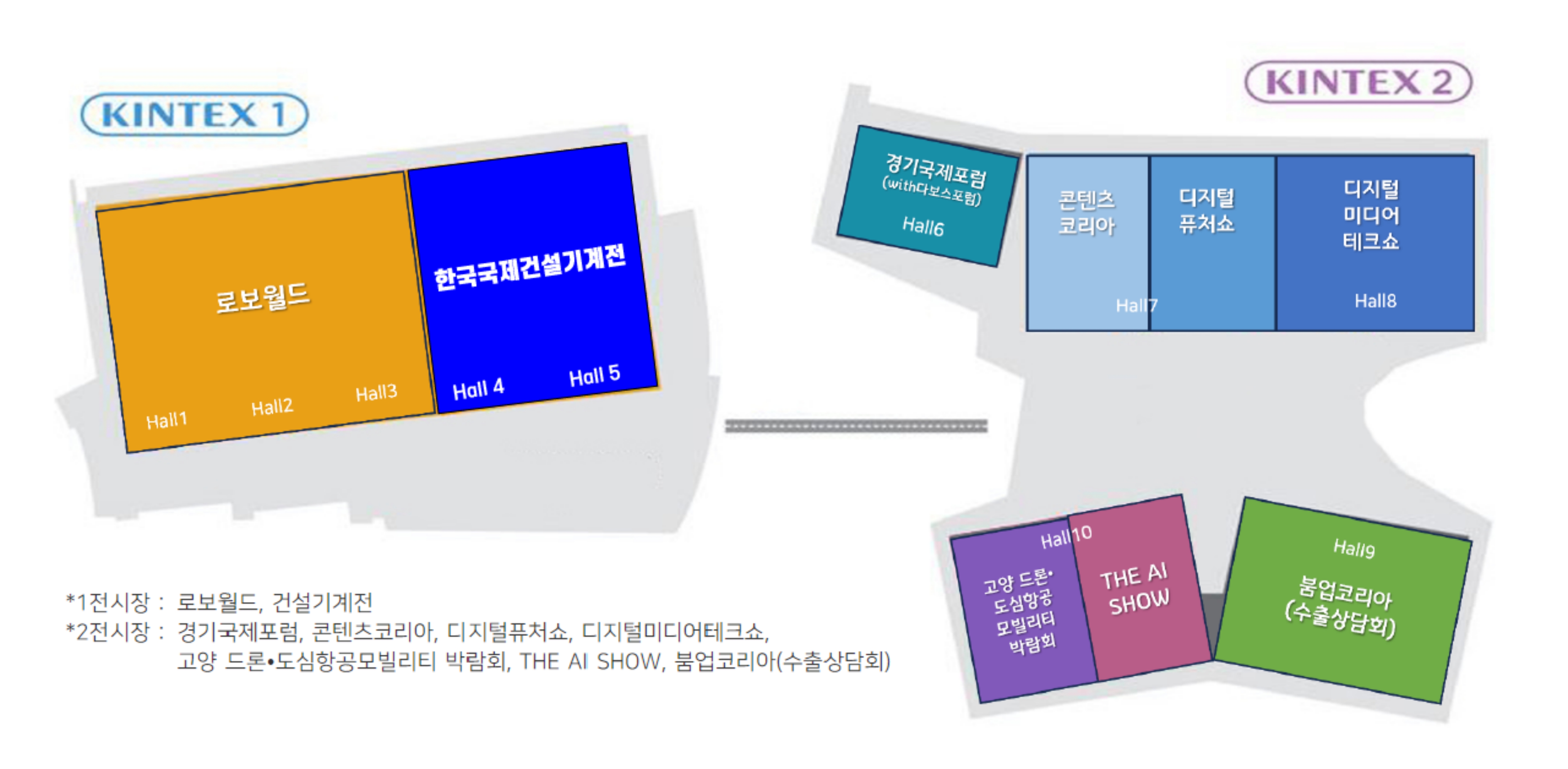 1전시장에서는 △한국국제건설기계전 △로보월드가, 2전시장에서는 △고양드론·도심항공모빌리티박람회 △The AI Show △디지털퓨처쇼 △디지털미디어테크 △콘텐츠코리아 △붐업코리아 △경기국제포럼이 동시 개최될 예정이다.