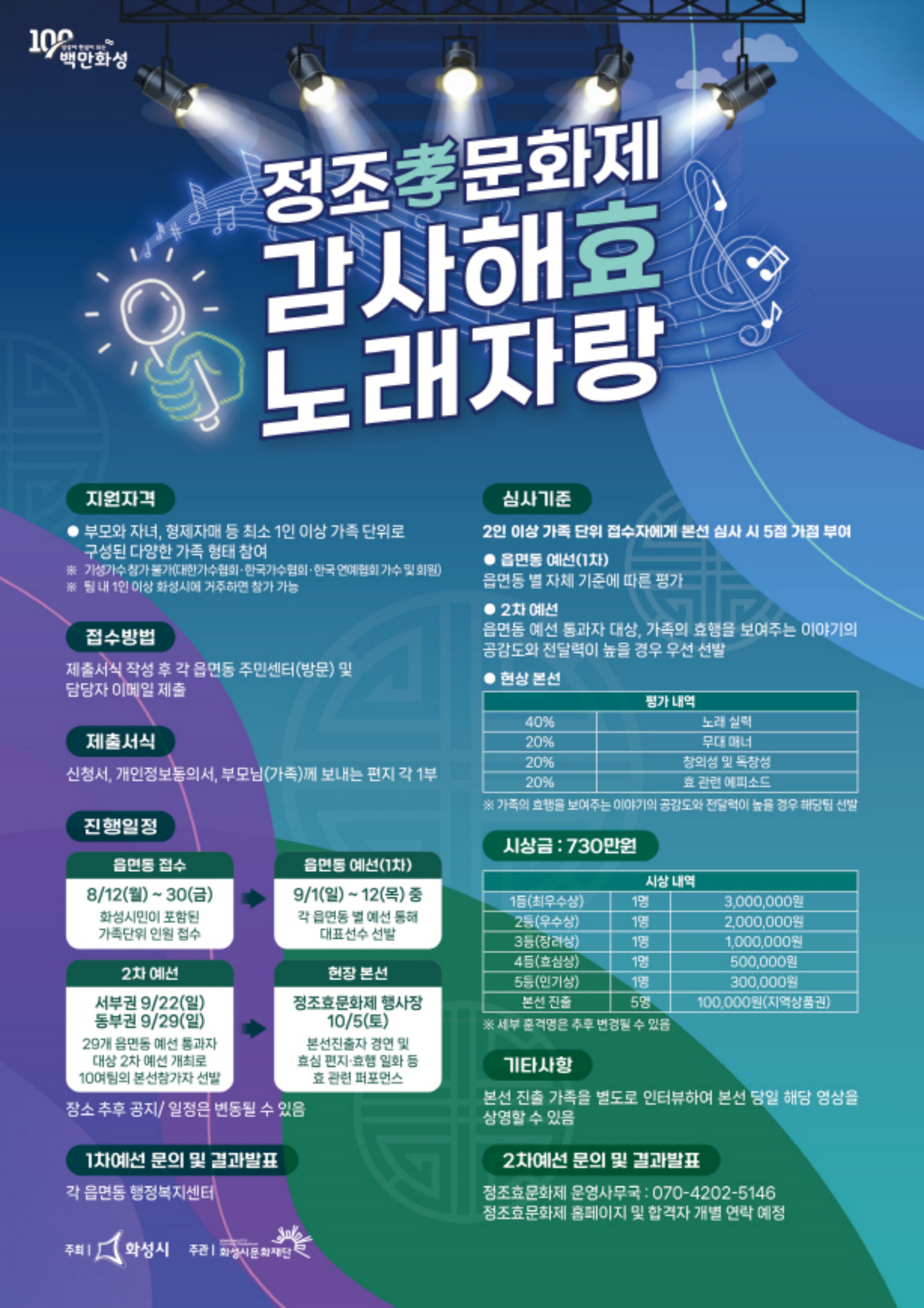 감사해효 노래자랑 접수는 오는 8월 12일(월)부터 30일(금)까지 각 읍, 면, 동 행정복지센터에서 신청 가능하며 보다 자세한 내용은 화성시청 홈페이지 또는 각 읍, 면, 동 행정복지센터에 문의해 확인할 수 있다.