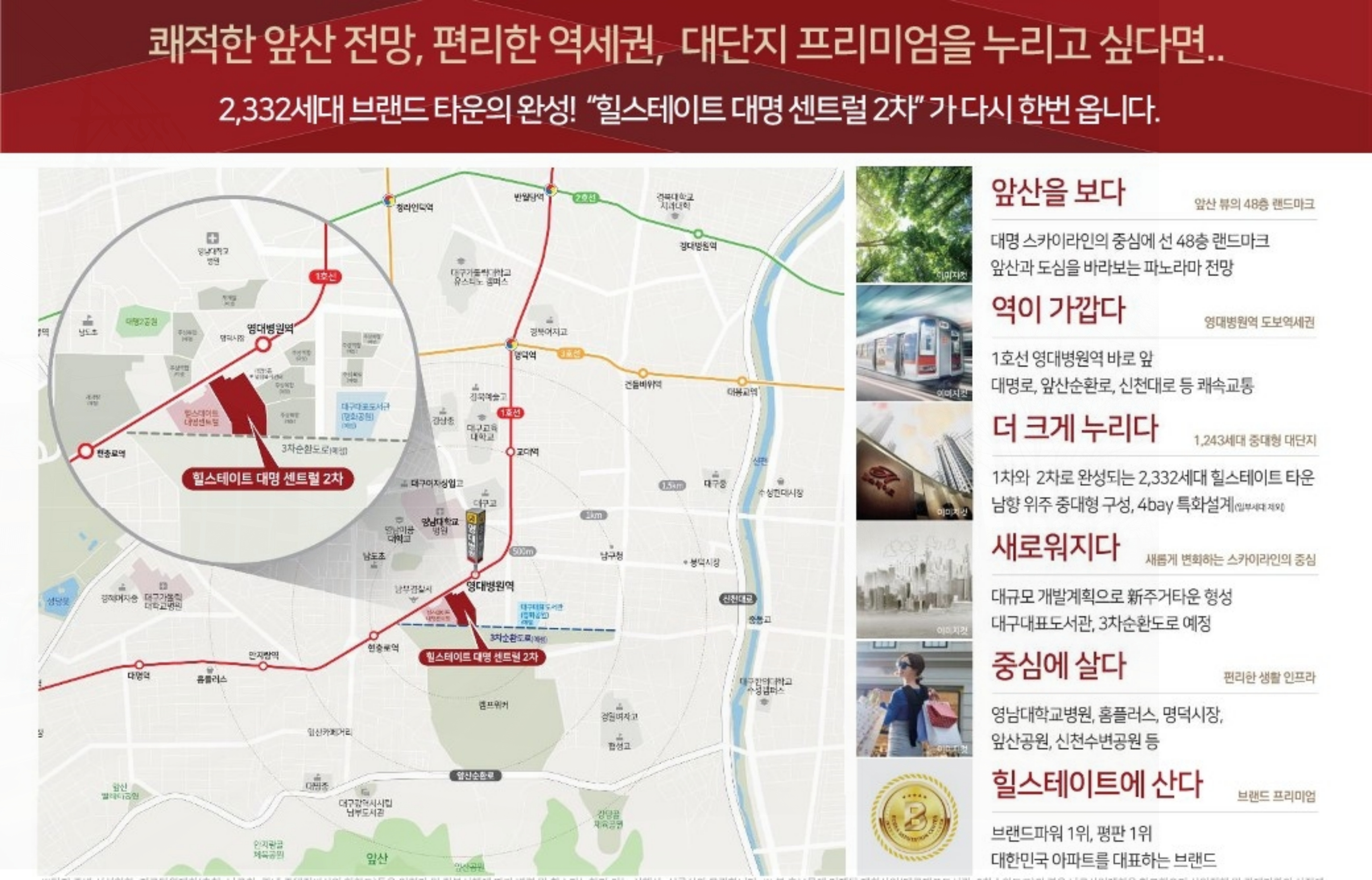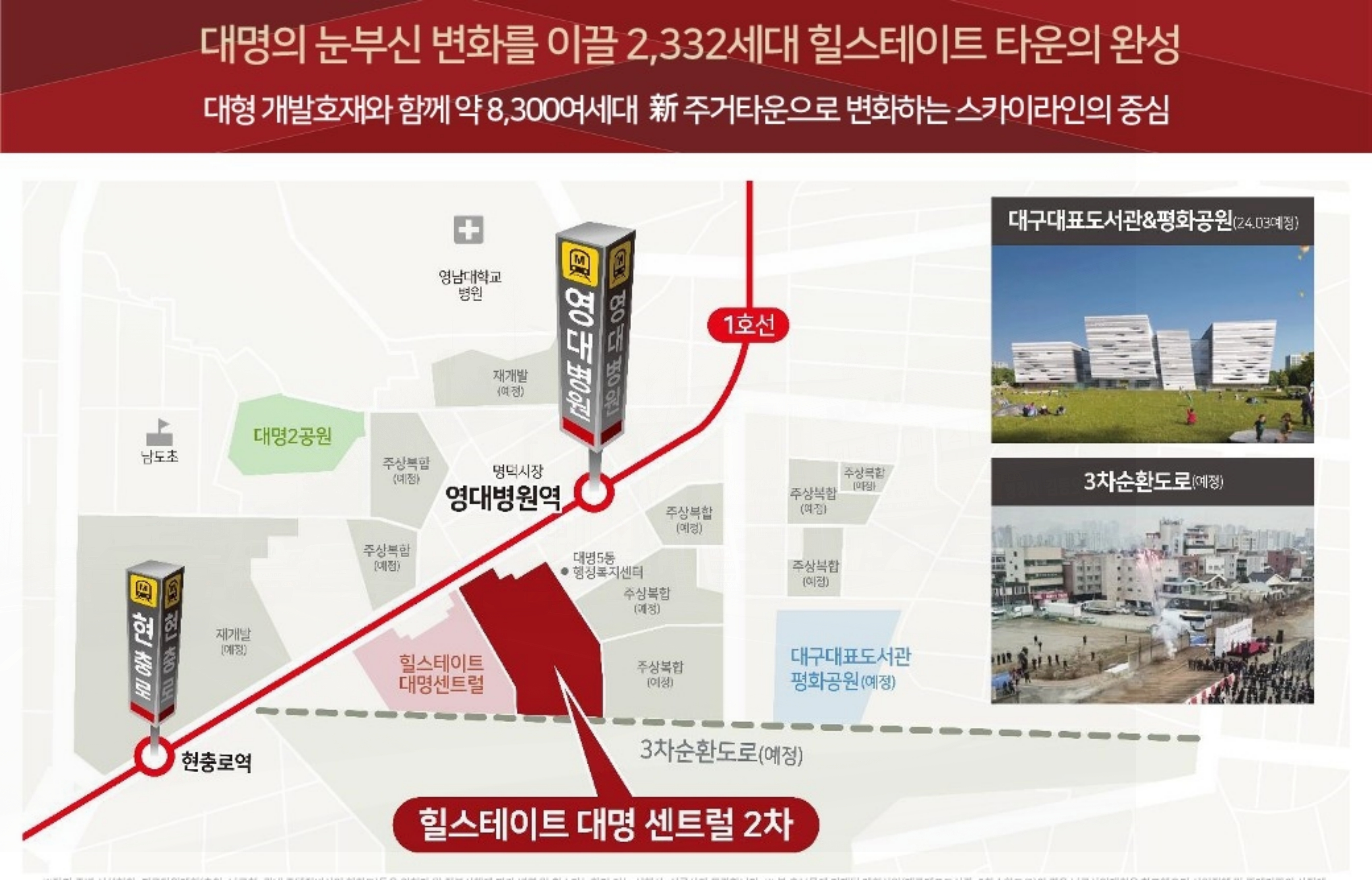 힐스테이트 대명 센트럴 2차 주변은 영대병원역 지하철 역이 있기 때문에 역세권으로 매우 편리한 교통망을 구축하고 있답니다. 지하철을 타고 몇 정거장 내에 다양한 중심 상업시설과 다양한 인프라가 밀집해 있다는 점 역시 생활권 영역을 조금 더 폭넓게 이용 및 활용할 수 있다는 장점도 가지고 있습니다.