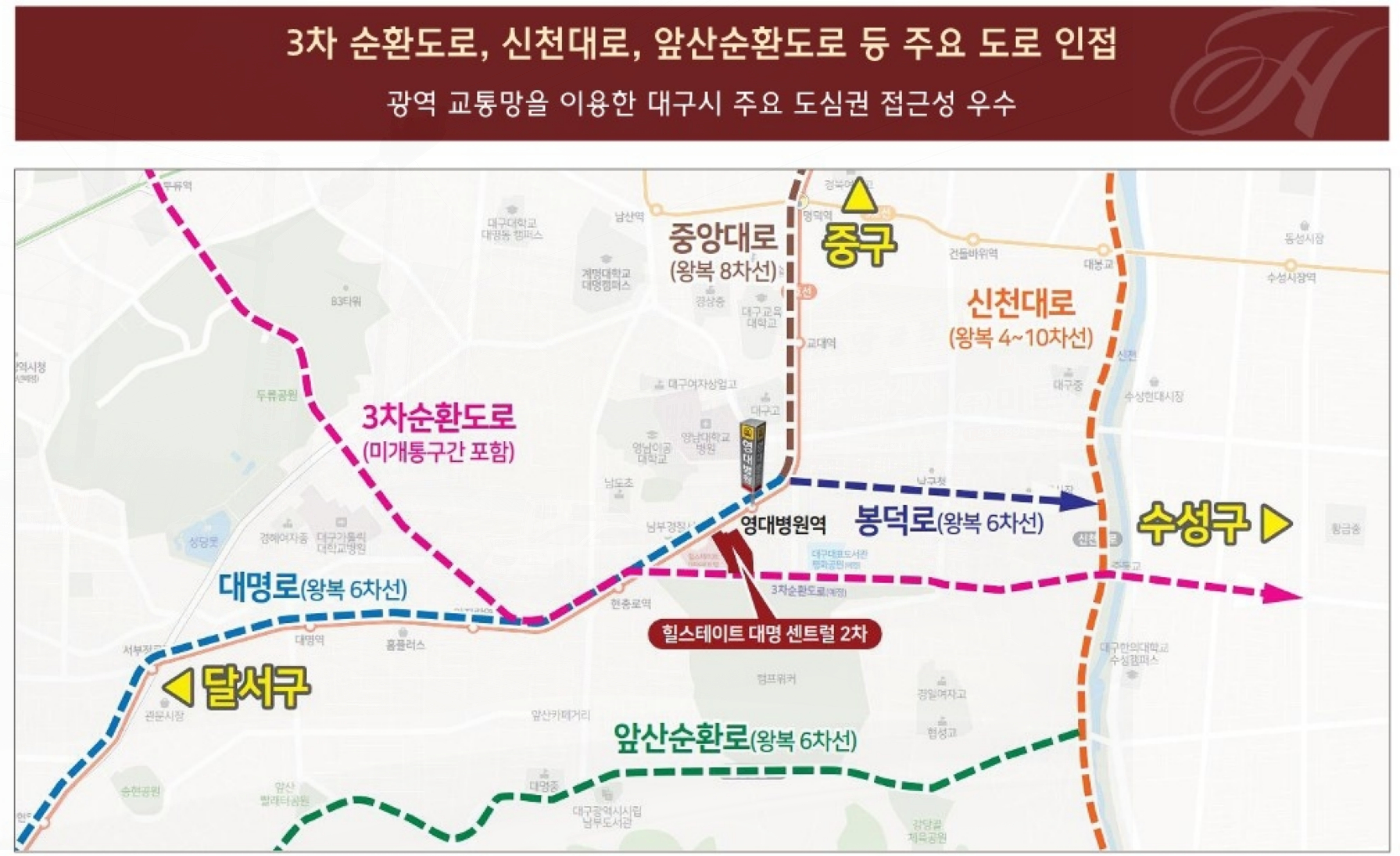 자기 차량 이동도 앞산순환로, 대명로, 신천대로 등의 도로 진입이 빠르게 때문에 도심 중심지역 및 주변 지역으로의 이동이 매우 편리합니다.