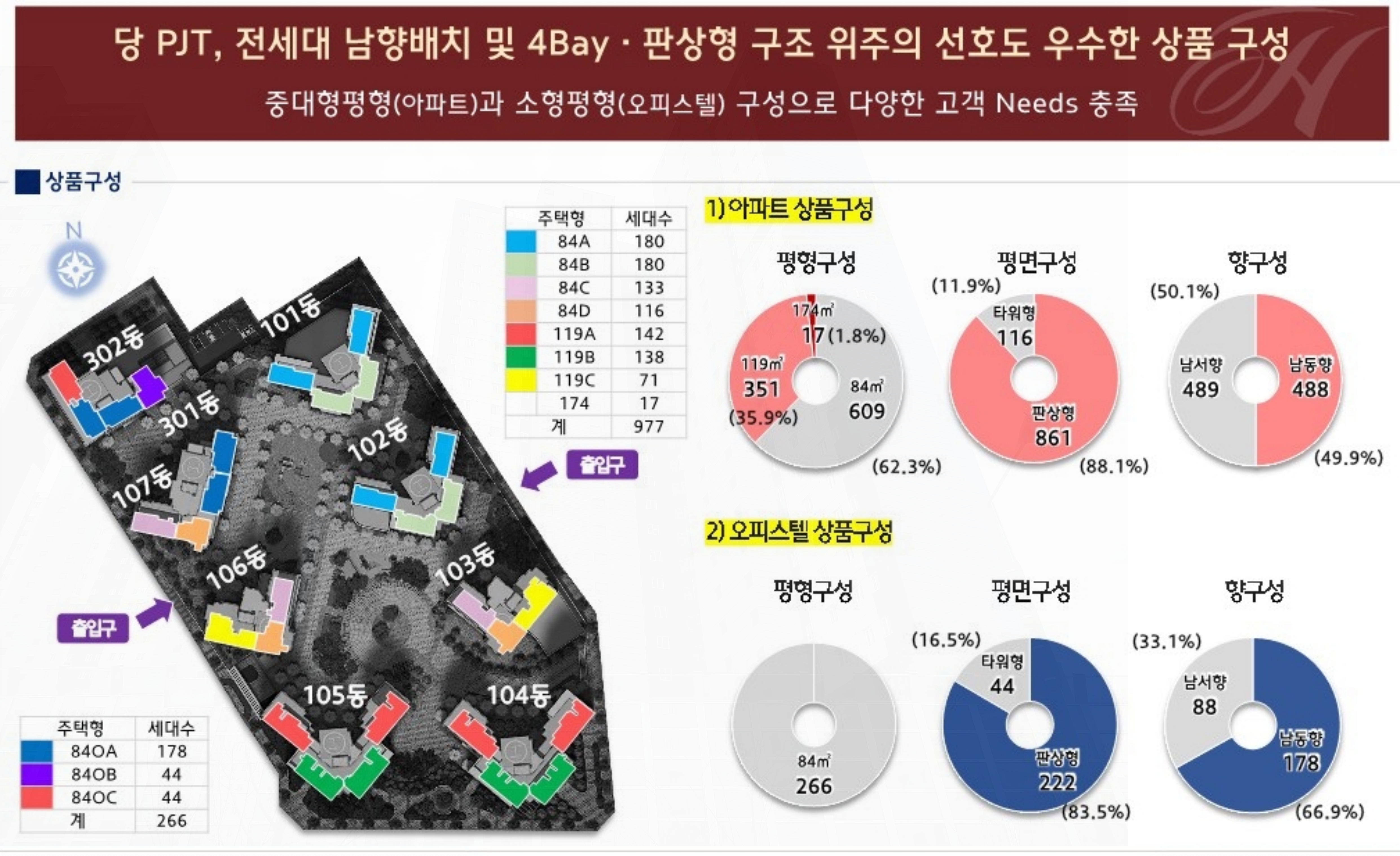 공동주택은 84㎡, 119㎡, 174㎡의 중대형 평수가 9가지 타입으로 구성되어 있습니다.