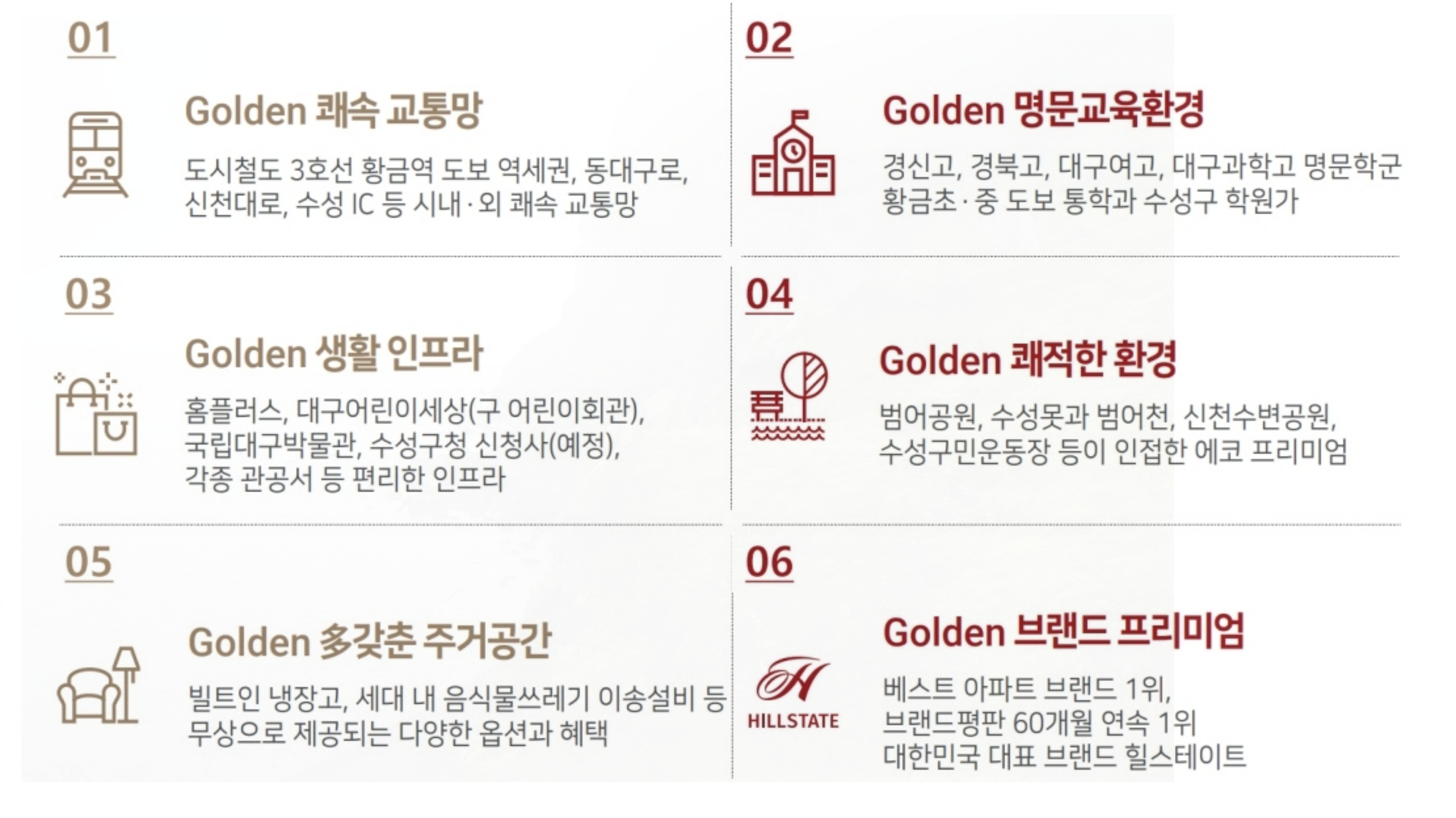 이어, 대구 도시철도 3호선 황금역이 도보 5분 거리에 위치한 초역세권 단지로, 대구 주요 업무 지구와의 직주 근접성이 매우 뛰어납니다.