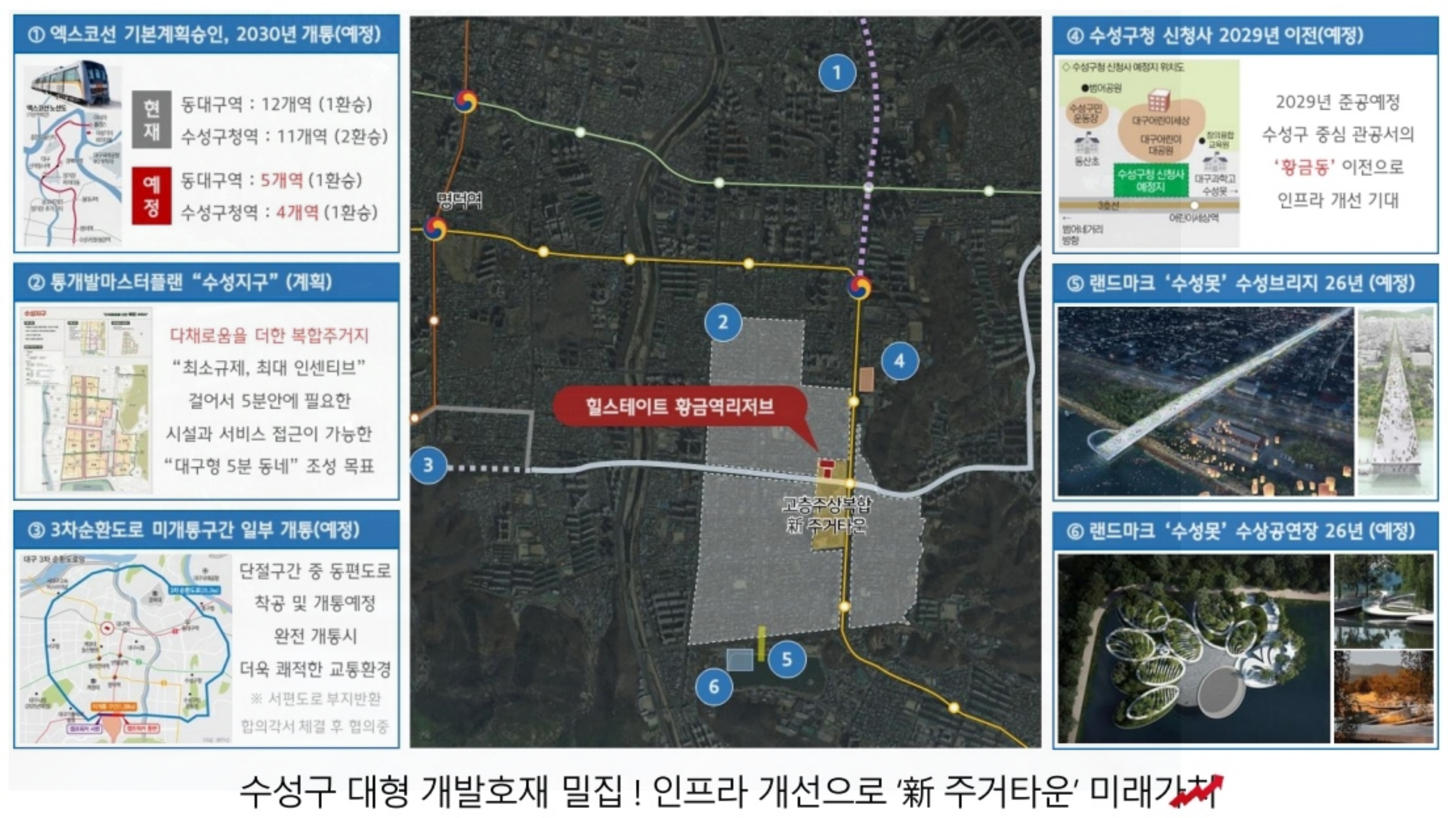 엑스코선 개통 예정으로 구민운동장역을 시작으로 범어역, 벤처밸리네거리, 아시아폴리스까지 대구 도시철도 1, 2, 3호선을 모두 잇는 엑스코선이 2030년 개통을 목표로 진행 중에 있습니다.