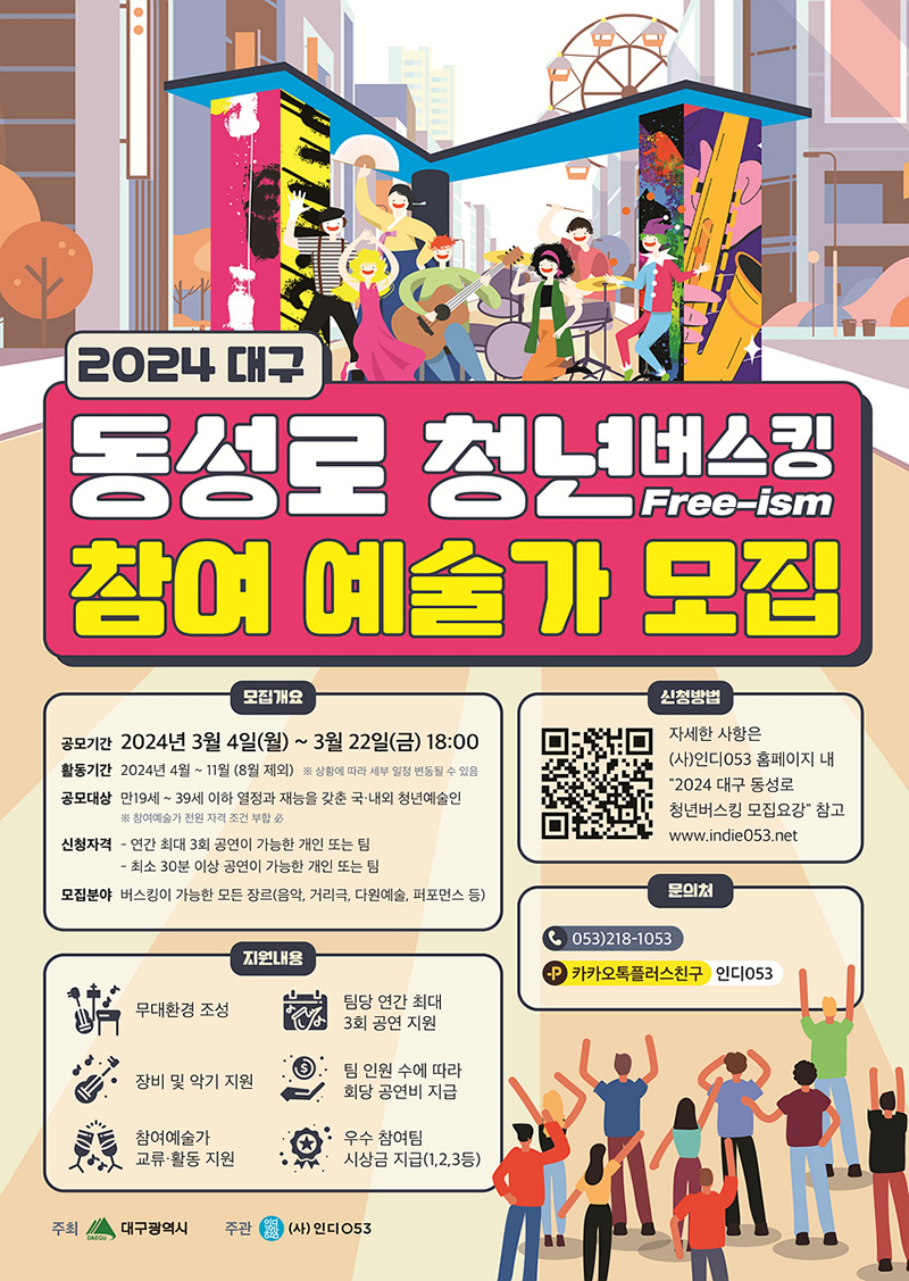 동성로 청년버스킹 참가신청은 3월 22일까지이며, 자세한 사항은 사업 주관단체인 (사)인디053 홈페이지를 통해 확인할 수 있다.