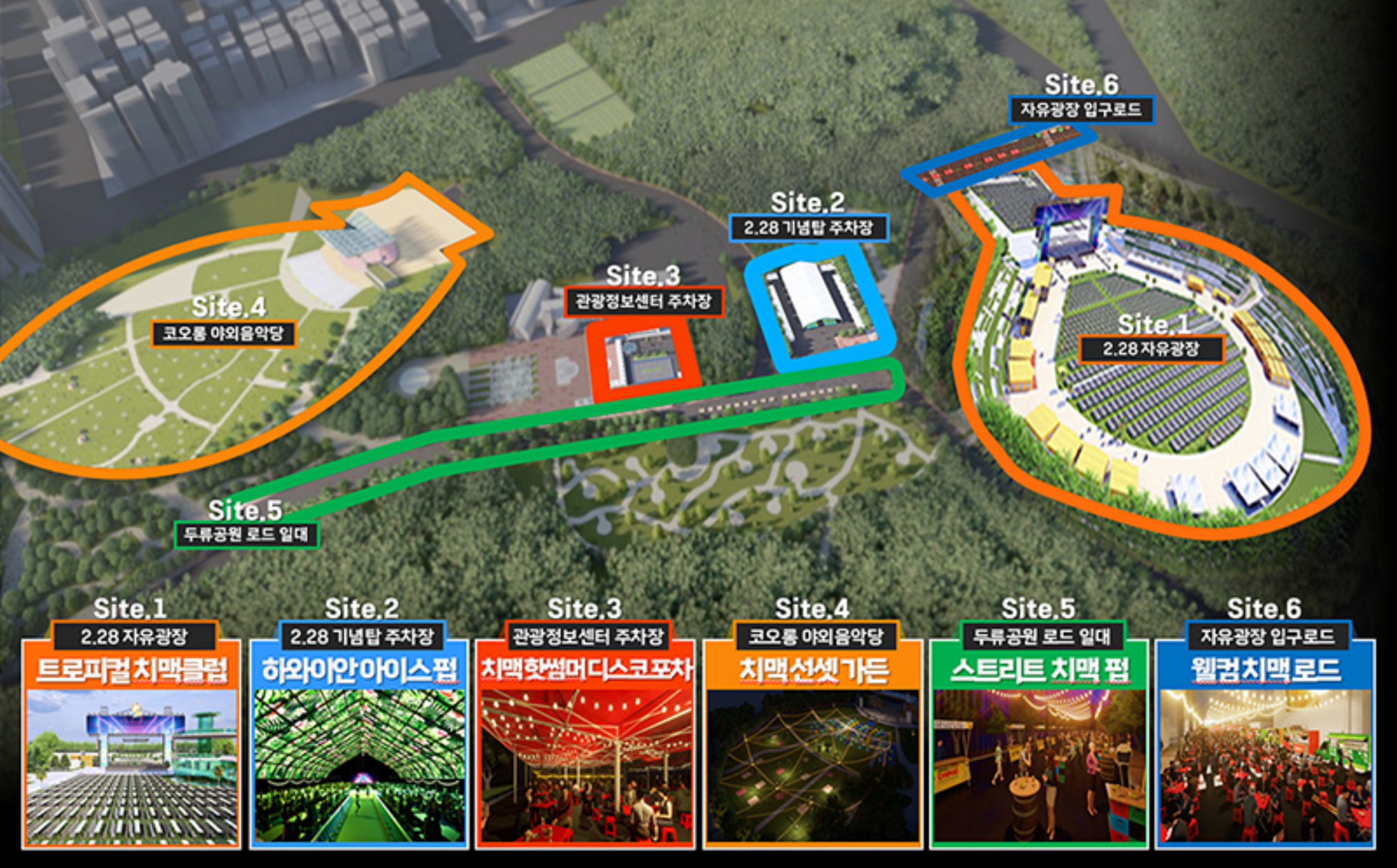 열기와 비를 막을 수 있는 TFS 텐트로 공간을 조성했고, 실링팬과 공조 순환구를 설치해 쾌적한 공간에서 치맥을 즐길 수 있다. 코오롱 야외음악당은 치맥 선셋 가든으로 꾸며진다.