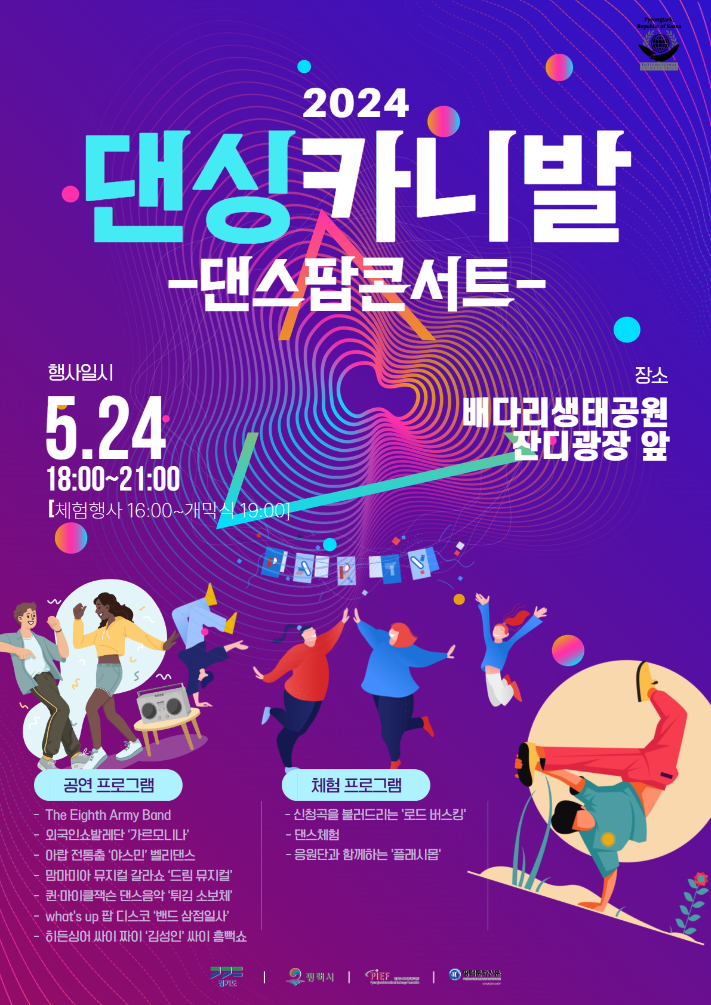 올해로 7회를 맞이한 2024 댄싱카니발 댄스팝콘서트가 오는 24일(금) 평택시 배다리생태공원 잔디광장 앞에서 개최된다.
