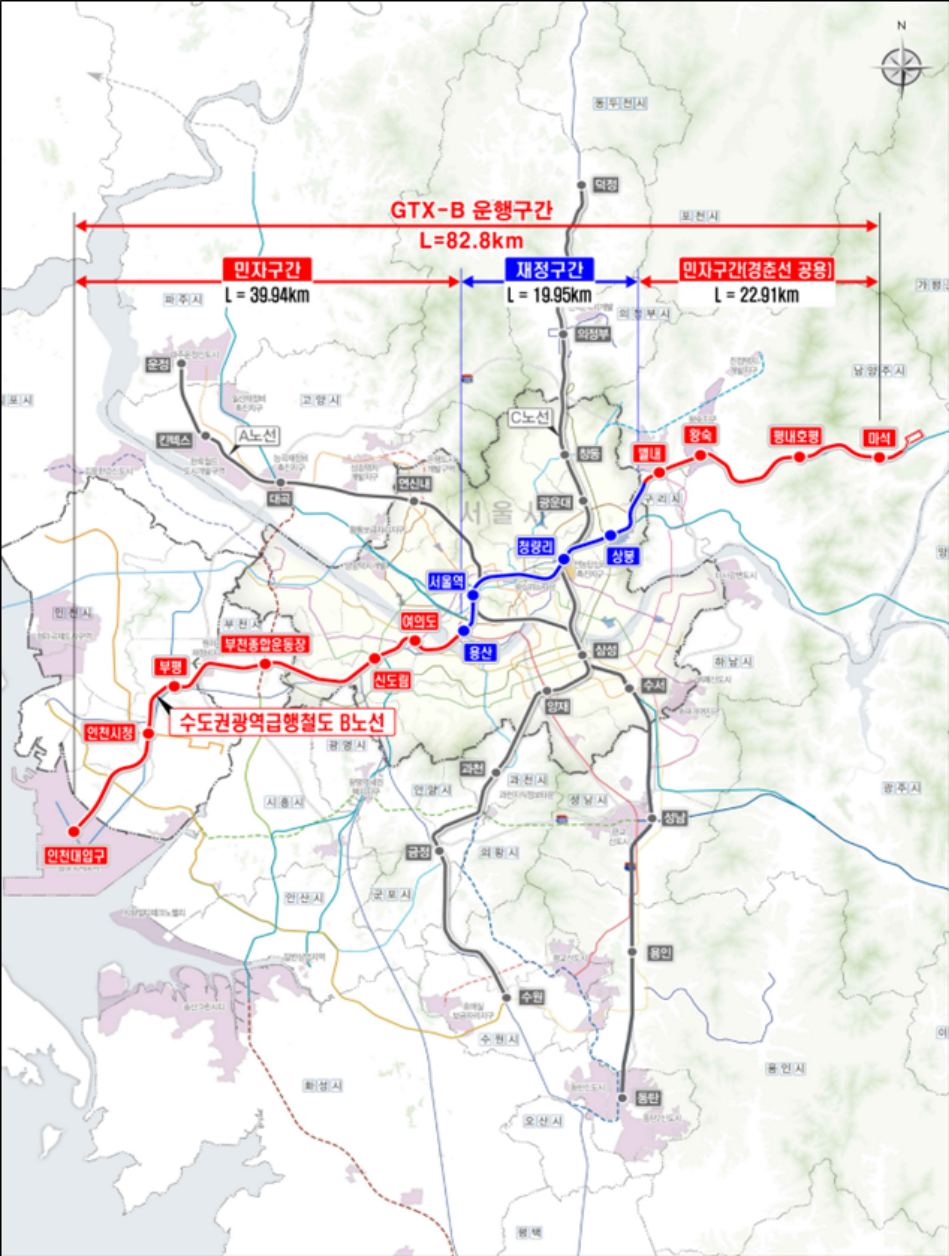 △용산역 ~ 상봉역 간 약 20㎞는 재정구간으로, △인천대입구역 ~ 용산역 간 약 40㎞ 구간과 △상봉역 ~ 마석역 간 약 23㎞구간은 수익형 민간투자(BTO) 방식으로 건설하고, 전체 구간을 민자 사업자가 운영하게 된다.