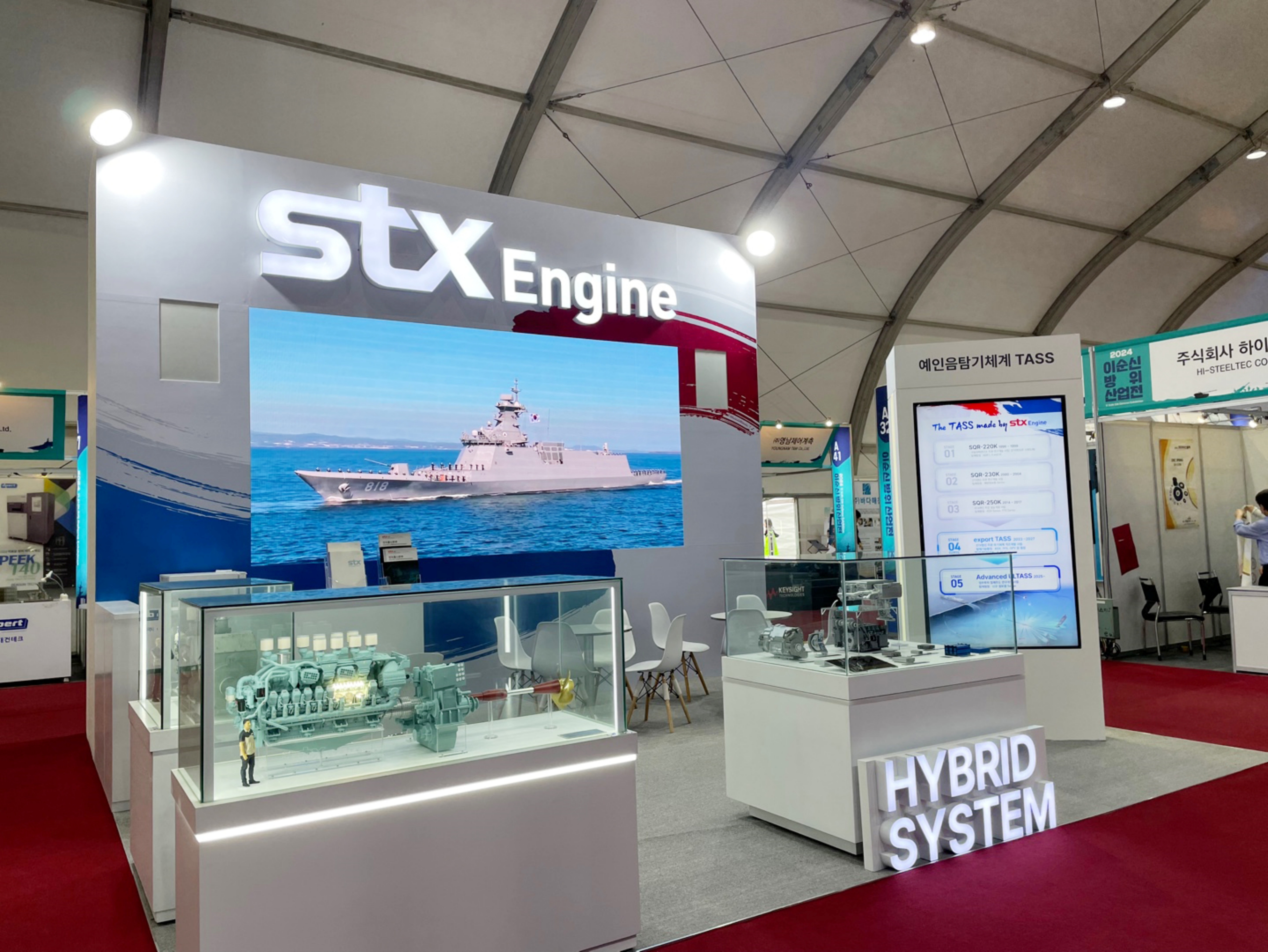 STX엔진은 이번 전시회에서 해군의 기뢰부설함(MLS-II), 유도탄 고속함(PKG) 등에 적용 중인 1163시리즈 주기용 엔진과 3000톤급 잠수함(KSS-III Batch-II), 차기호위함(FFX-III) 등에 적용되는 4000시리즈 발전기 엔진 및 하이브리드 엔진 시스템 모형 등 다양한 장비를 전시한다.
