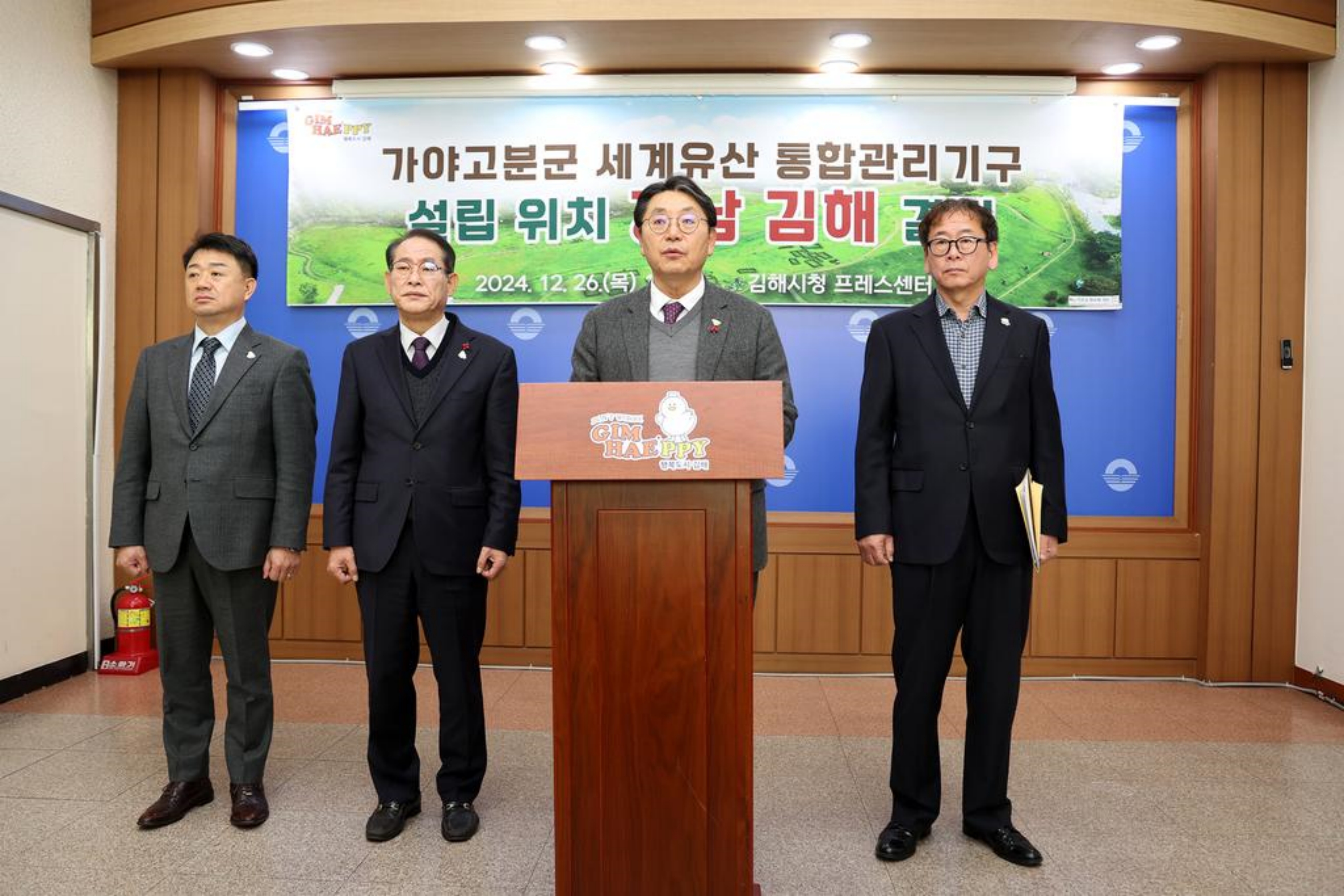 홍태용 김해시장은 26일 김해시청 브리핑룸에서 기자회견을 열고 가야고분군 세계유산 통합관리기구 설립 위치가 최종적으로 경남 김해시로 결정됐다고 발표했다.