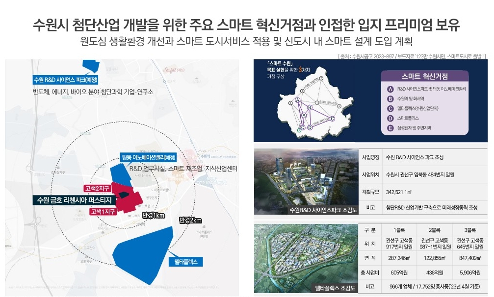 R&D 사이언스 파크, 탑동지구, 수원역 주변, 화서역 주변, 델타플렉스, 스마트폴리스, 삼성전자 주변 지역을 혁신 거점으로 구성해 사업지에 긍정적 영향을 미칠 것으로 보이고 있습니다.