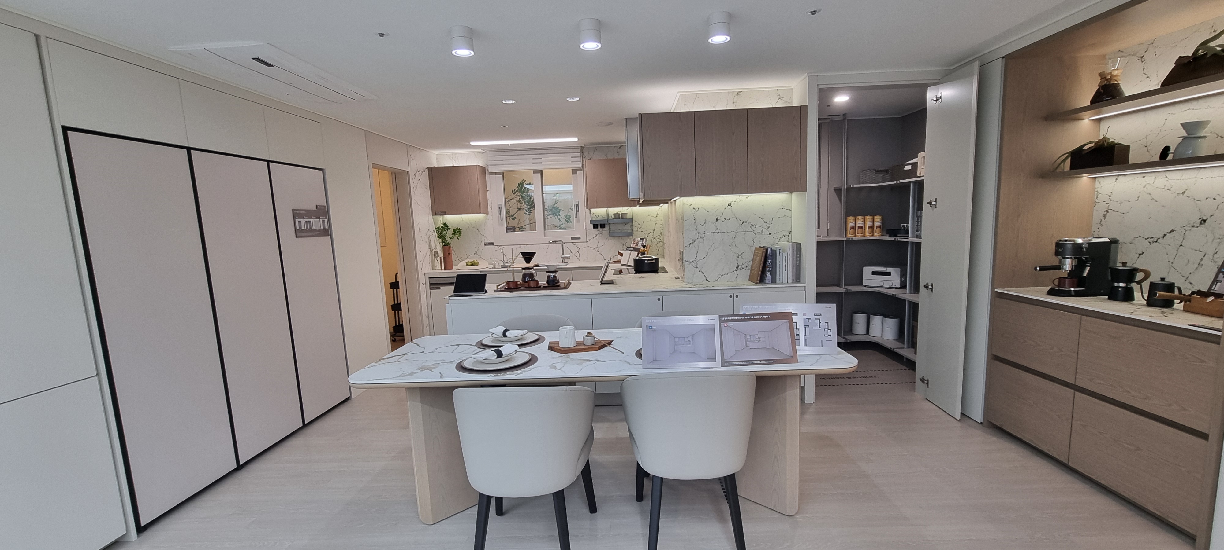 ㄷ자 아일랜드 대면형 주방과 세 개의 팬트리, 광폭 다용도실이 특징입니다.