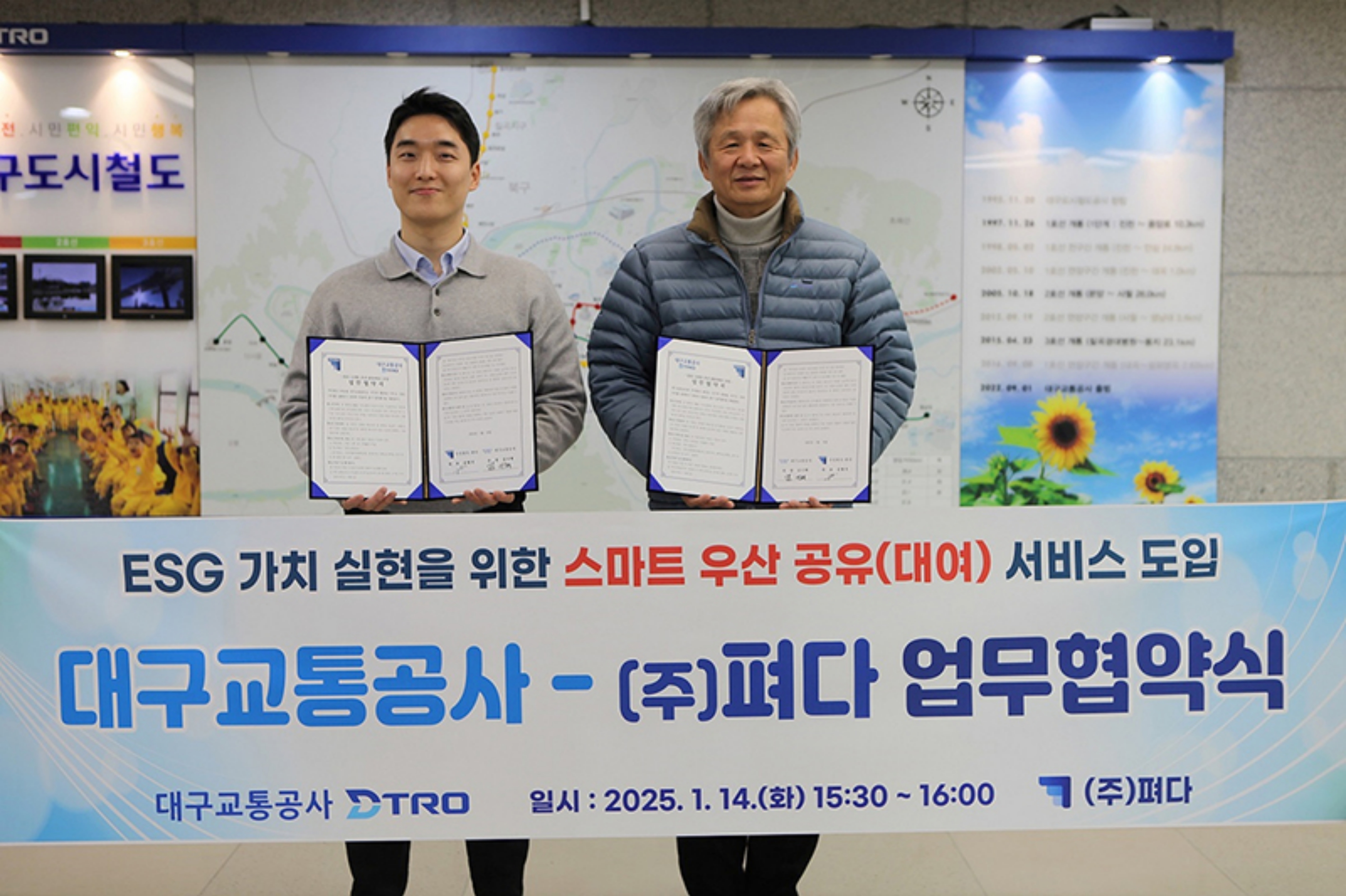 대구교통공사와 주식회사 펴다는 지난 14일(화) 대구교통공사 사장실에서 ESG 가치 실현을 위한 스마트 우산 공유서비스 시범도입을 위한 업무협약을 체결했다.