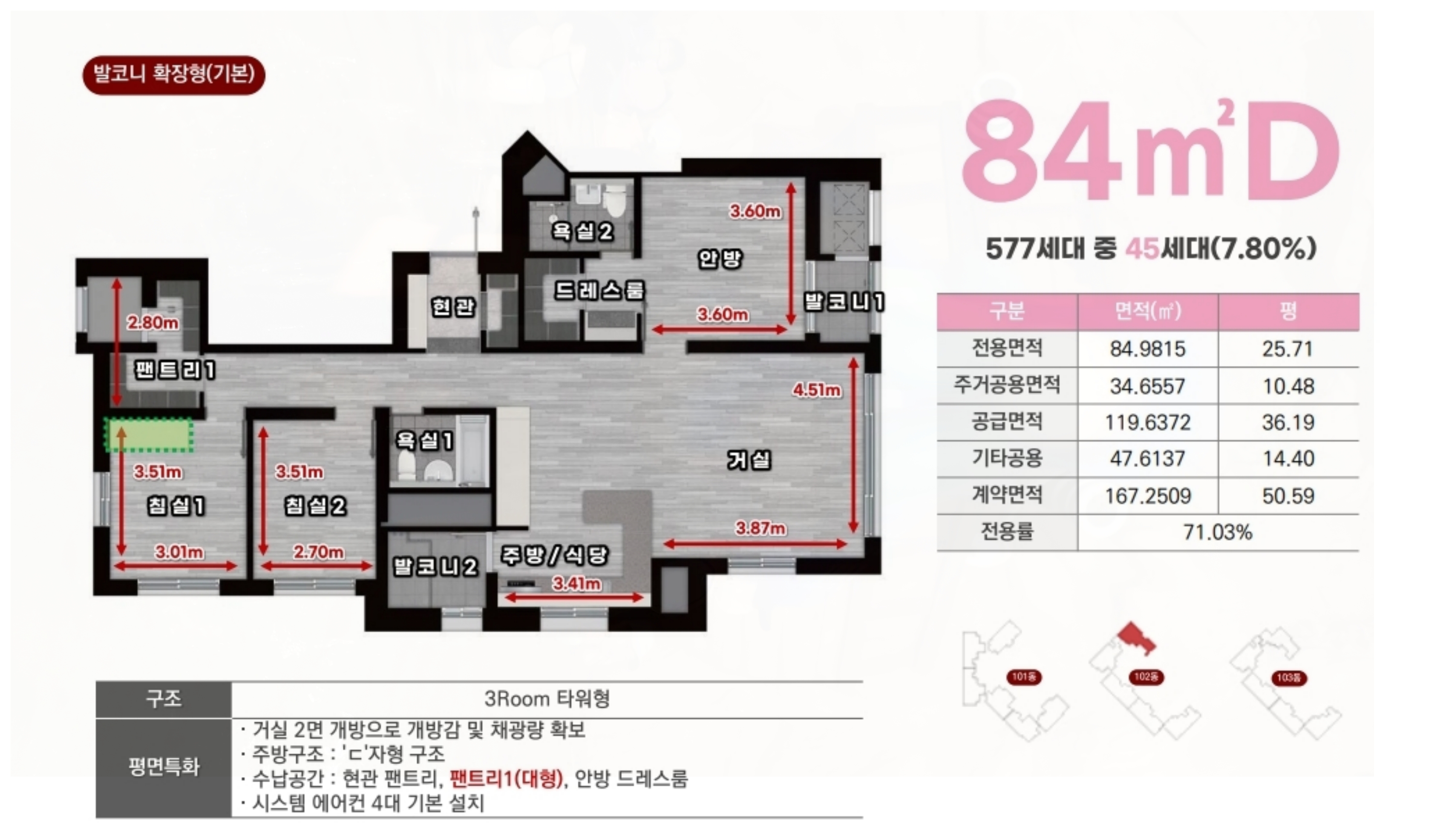 84G 타입: 'ㄷ'자 주방과 알파룸 구성으로 다채로운 가족 형태를 포용하며, 공간 활용도를 높였습니다