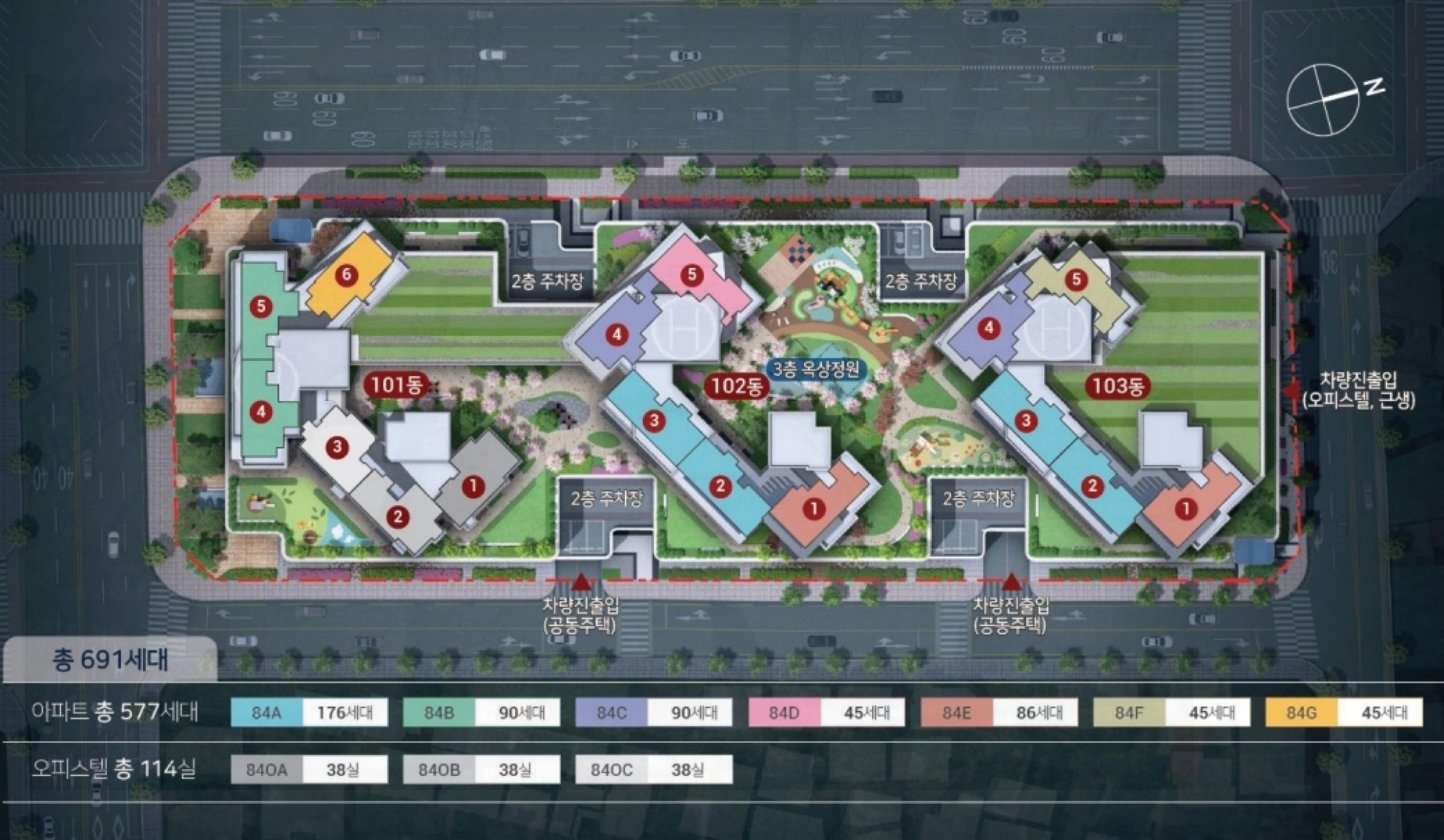 대지면적 12,985㎡, 연면적 122,054㎡에 달하는 압도적인 규모를 자랑하며, 총 691세대로 아파트 577세대와 오피스텔 114호실이 함께 건립되었습니다.