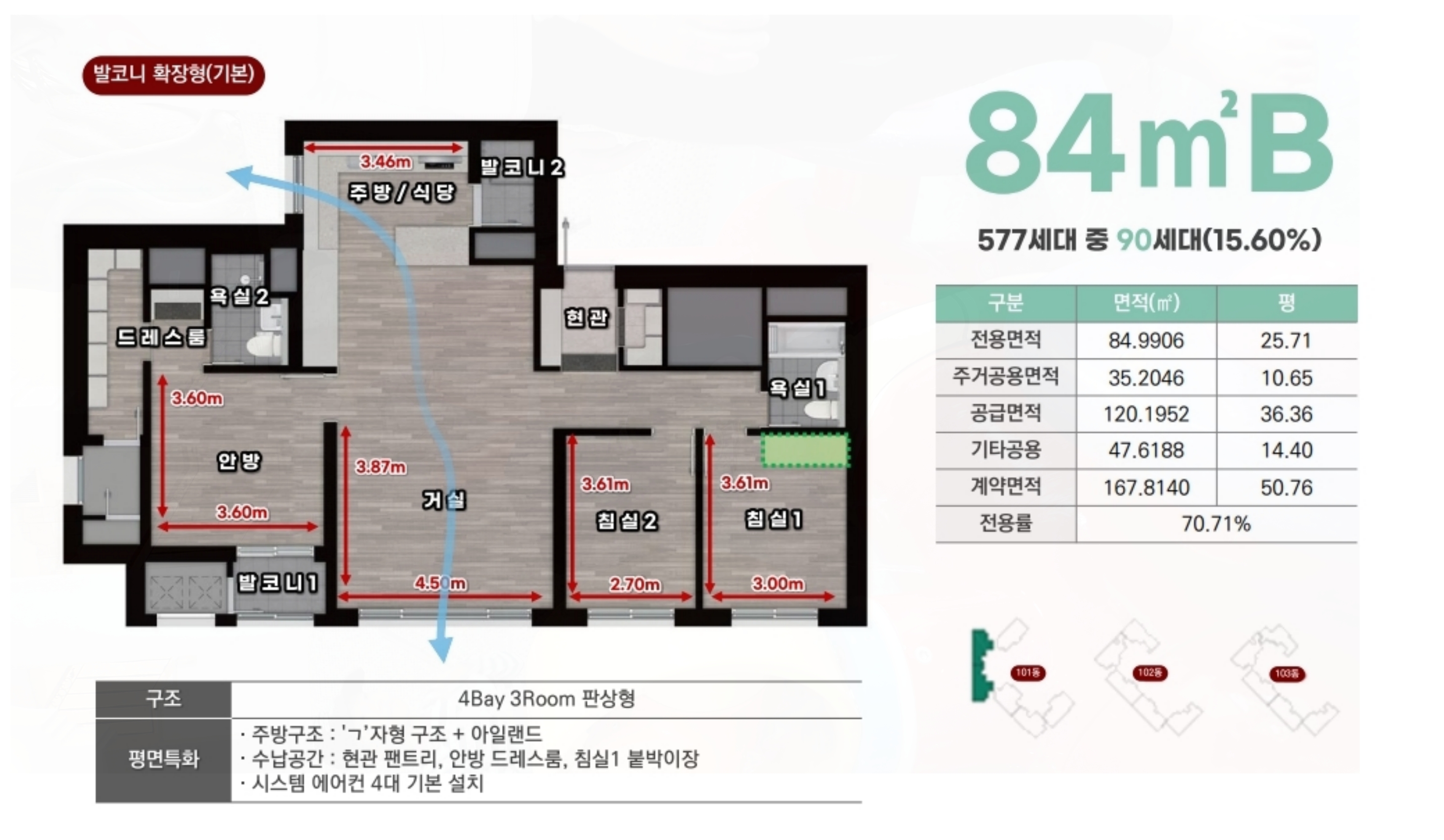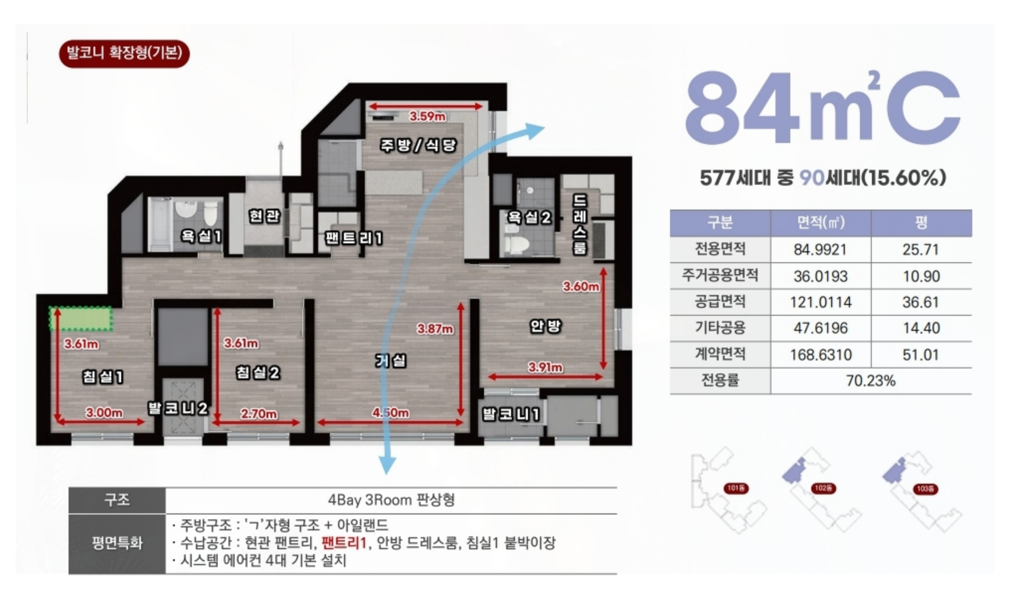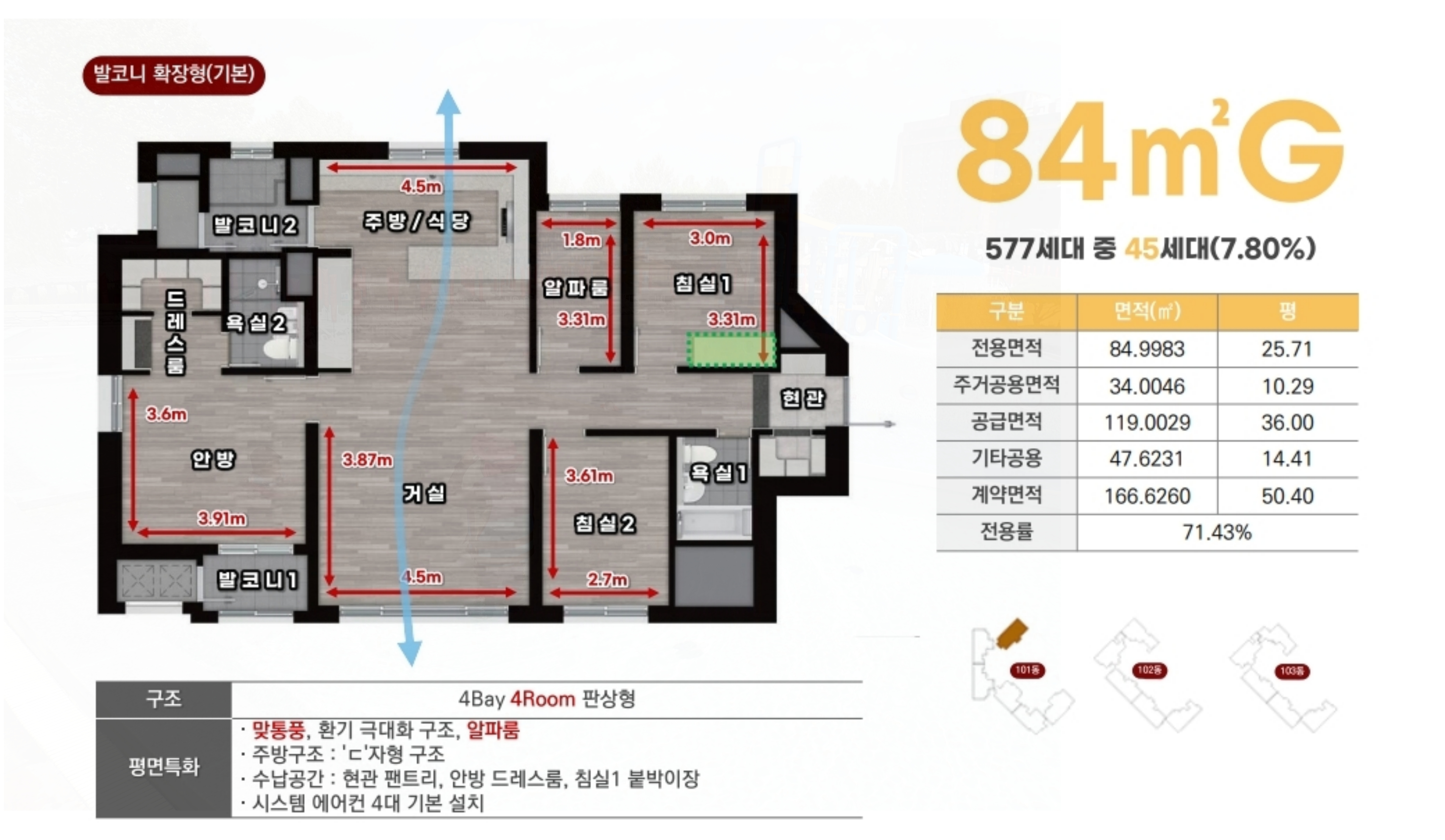 84A 타입: 선호도가 높은 4 Bay 판상형 구조로, 최신 트렌드에 맞춘 특화 설계를 선보입니다.