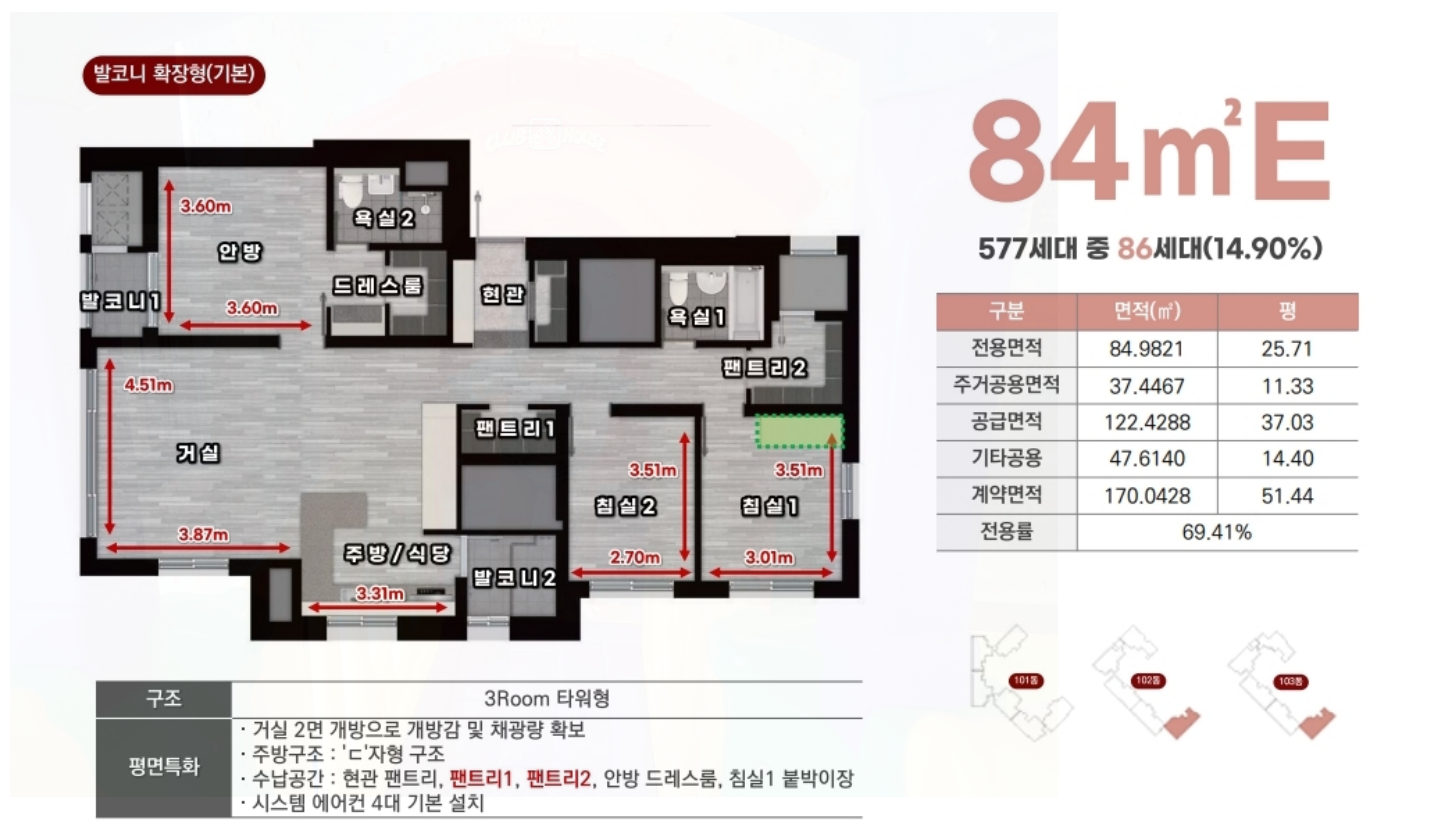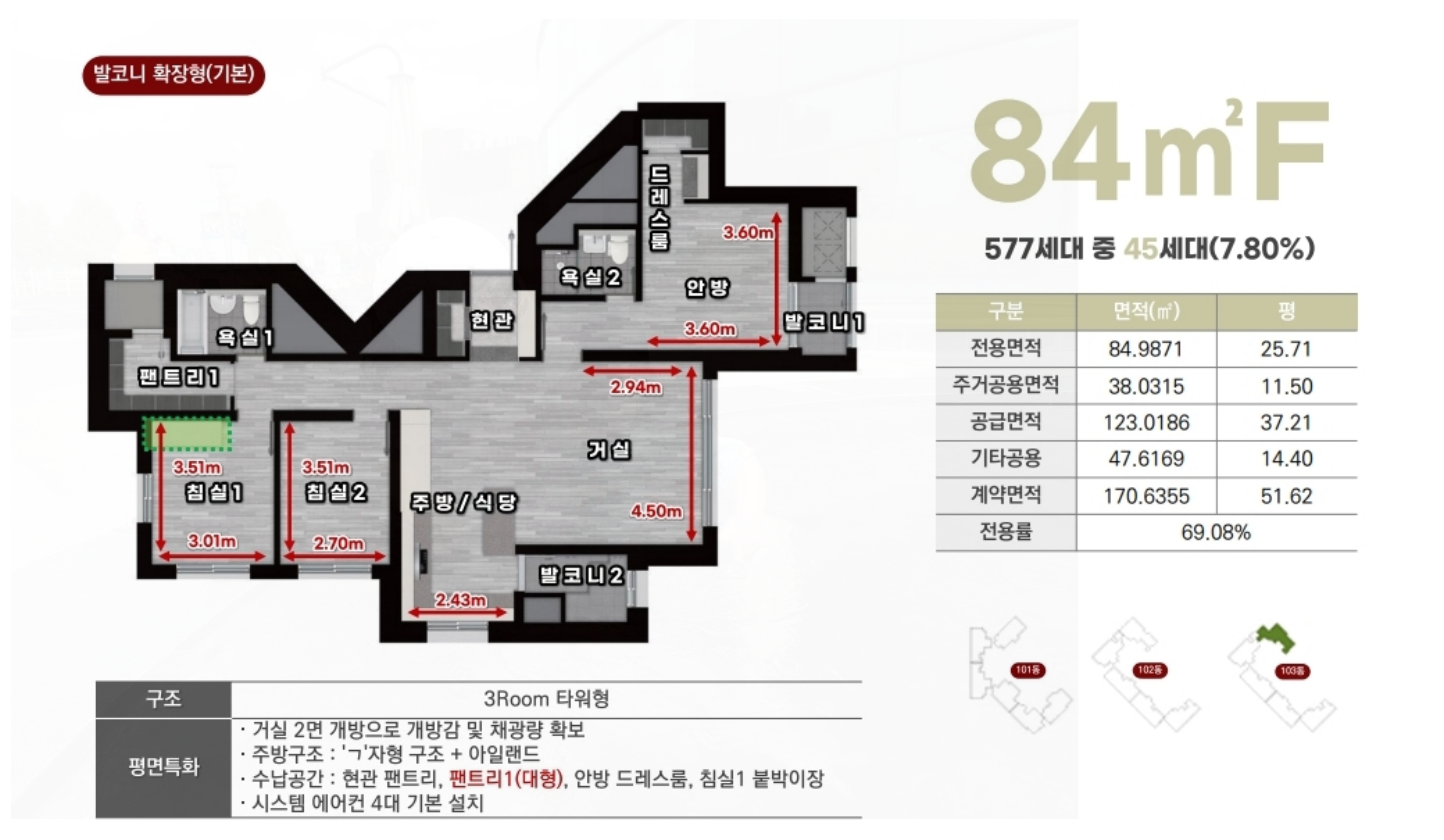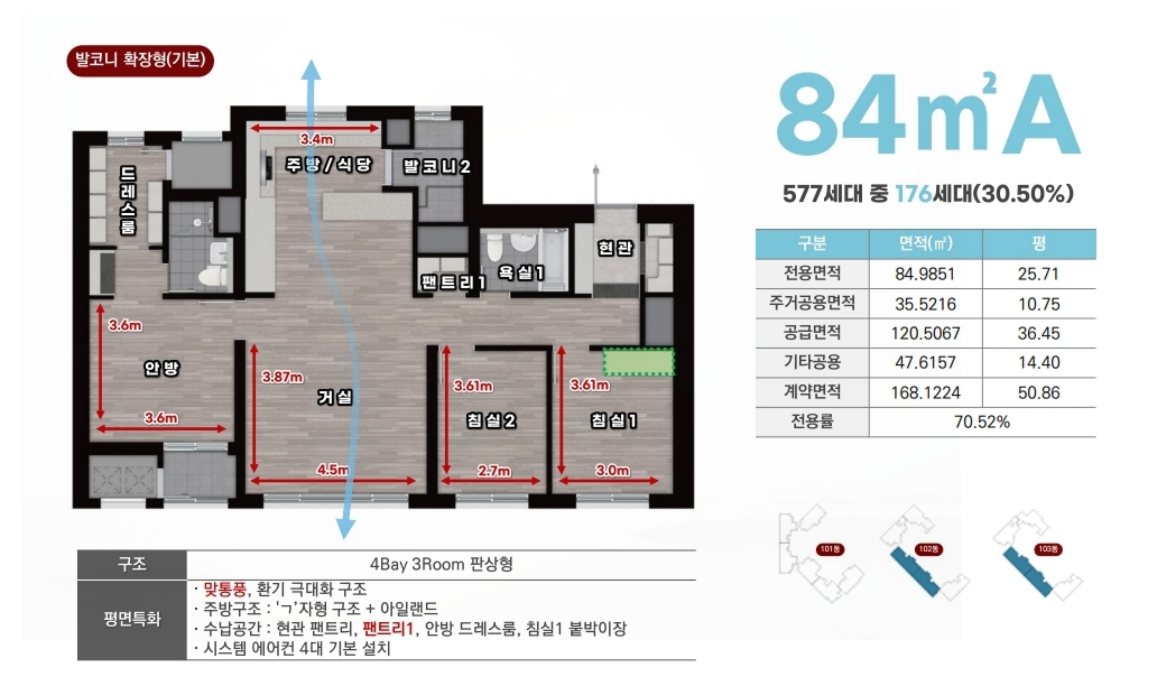 84A 타입: 선호도가 높은 4 Bay 판상형 구조로, 최신 트렌드에 맞춘 특화 설계를 선보입니다.
