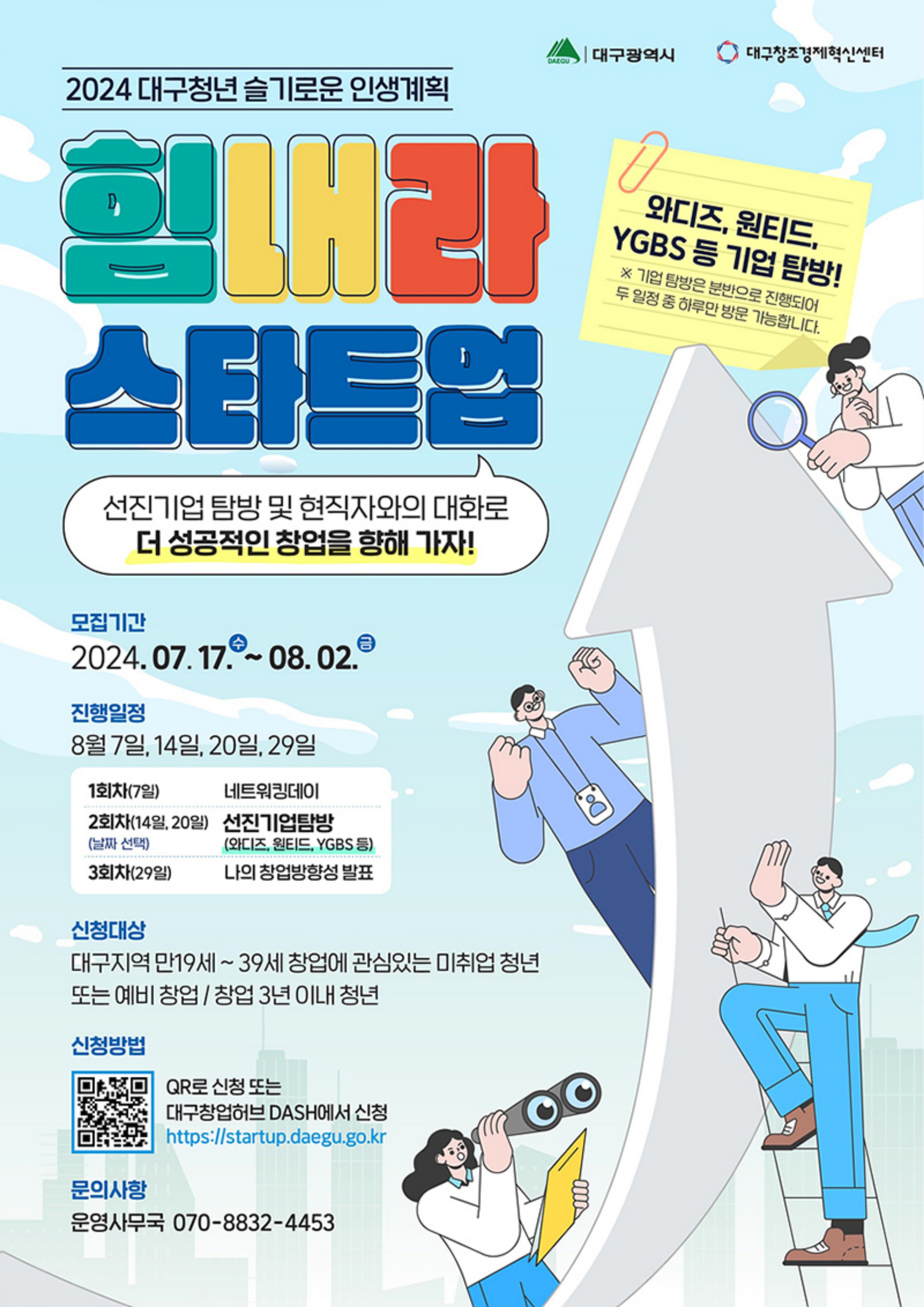 대구광역시는 예비창업자 또는 창업 3년 이내 청년 및 창업에 관심 있는 미취업 청년을 대상으로 창업 네트워킹을 형성하고 선진기업을 탐방할 기회를 제공하는 대구청년 힘내라 스타트업(Start-Up) 참가자를 8월 2일(금)까지 모집한다.
