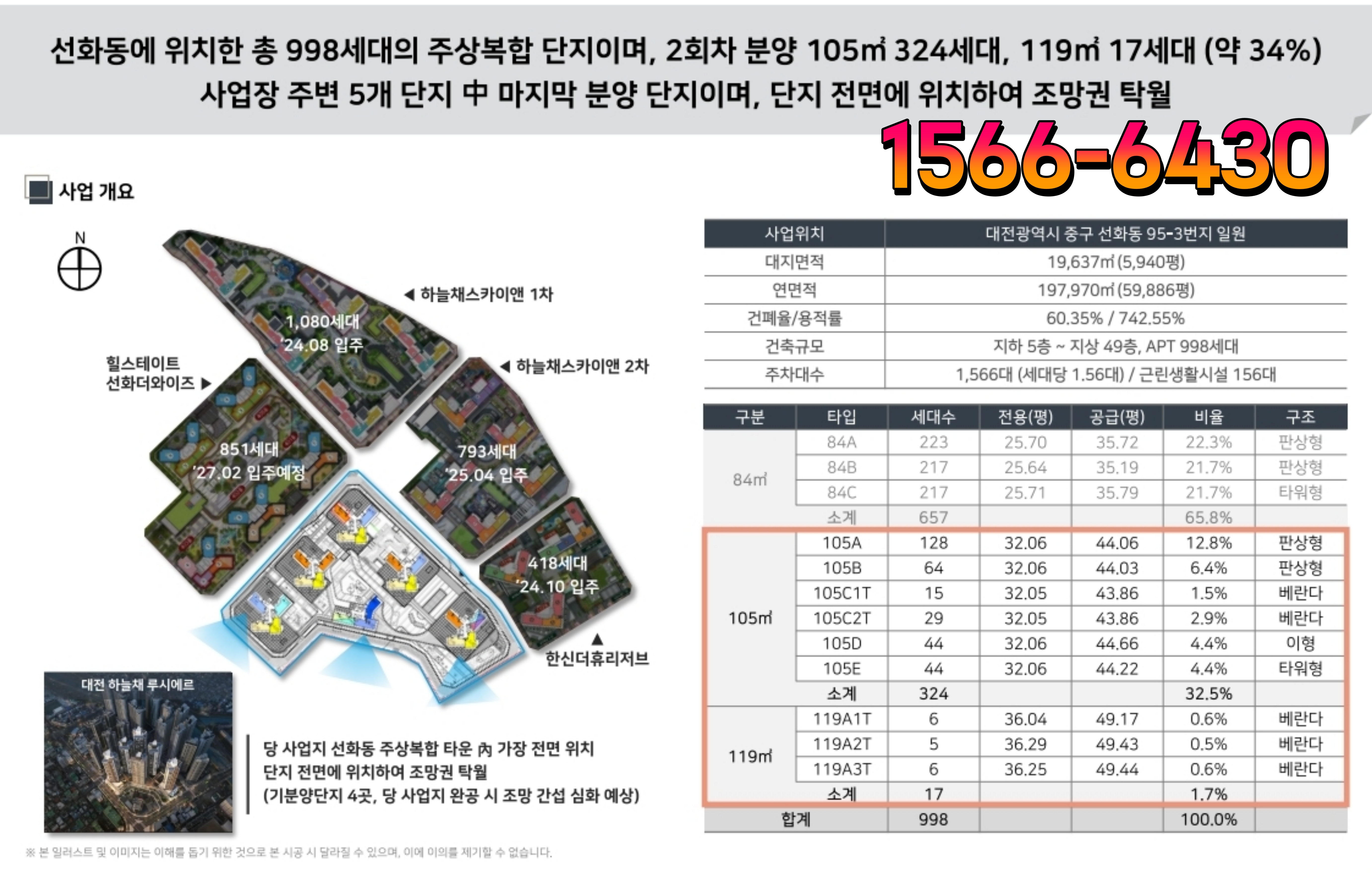 지하 5층에서 지상 49층, 총 6개 동으로 이루어진 이 단지는 998세대의 대규모 주거 공간으로 설계되었으며, 도심 중심부인 선화동 일대에서 직주근접 라이프를 원하는 수요자들에게 최적의 입지를 제공합니다.