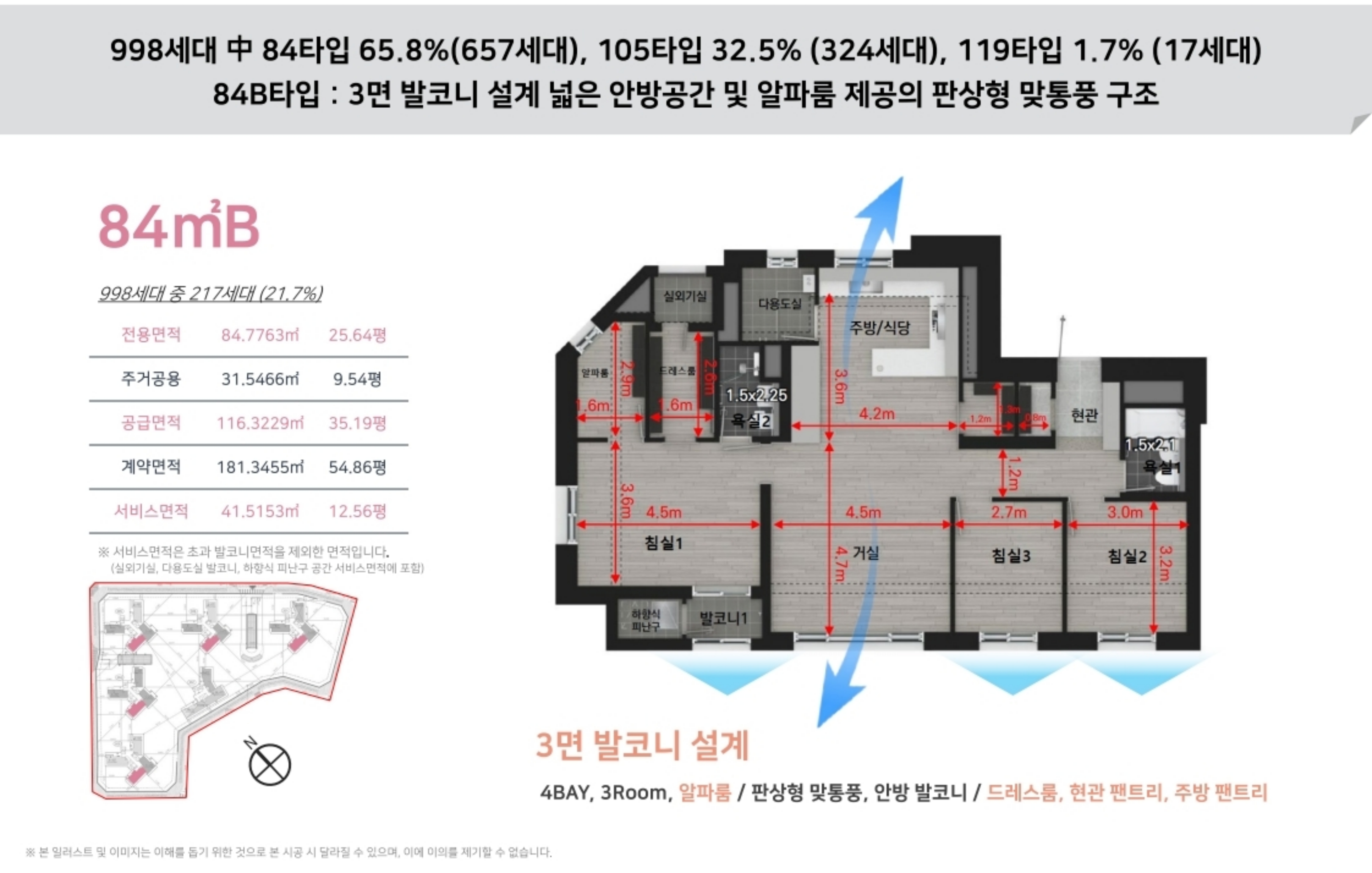 1차 분양 물량인 전용 84㎡는 3가지 타입(84A, 84B, 84C)으로 나뉘며, 2차 분양에서는 전용 105㎡와 119㎡ 평형대가 공급됩니다.