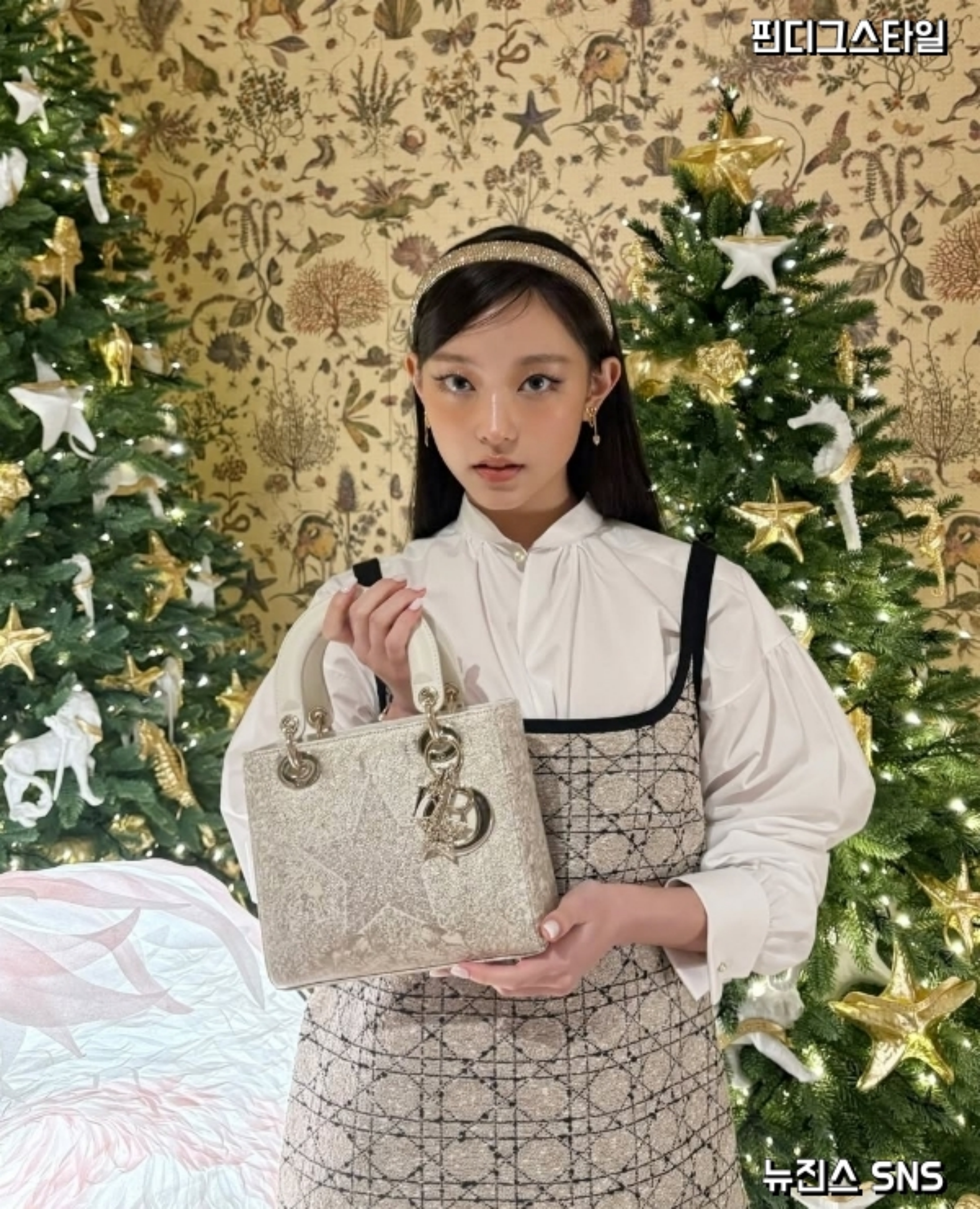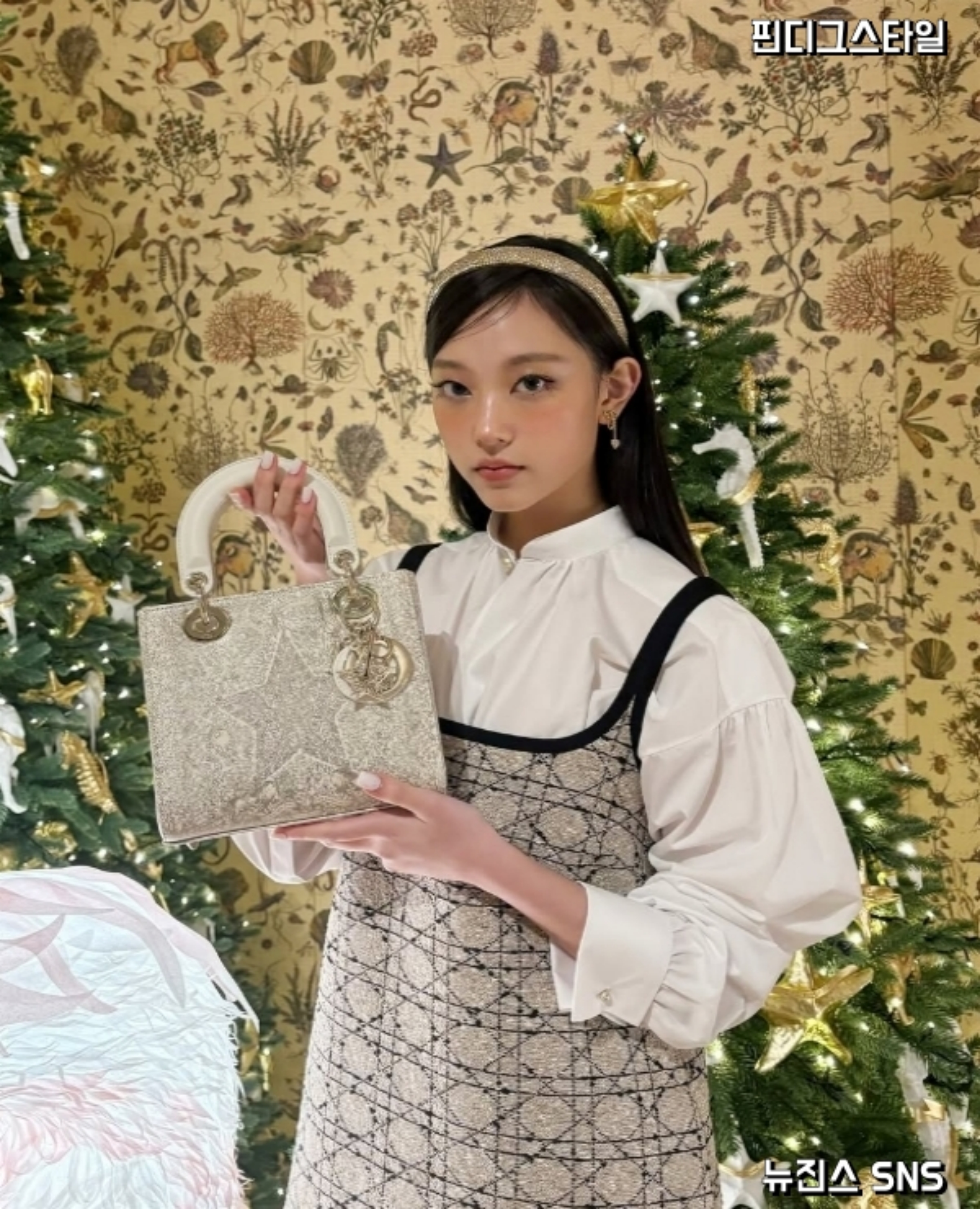 모두 디올 제품으로 화이트 블라우스와 트위드 원피스, 반짝반짝 빛나는 헤어밴드까지 연말연시 파티룩으로 아주 제격이다라는 평가를 받고 있기도 해요.