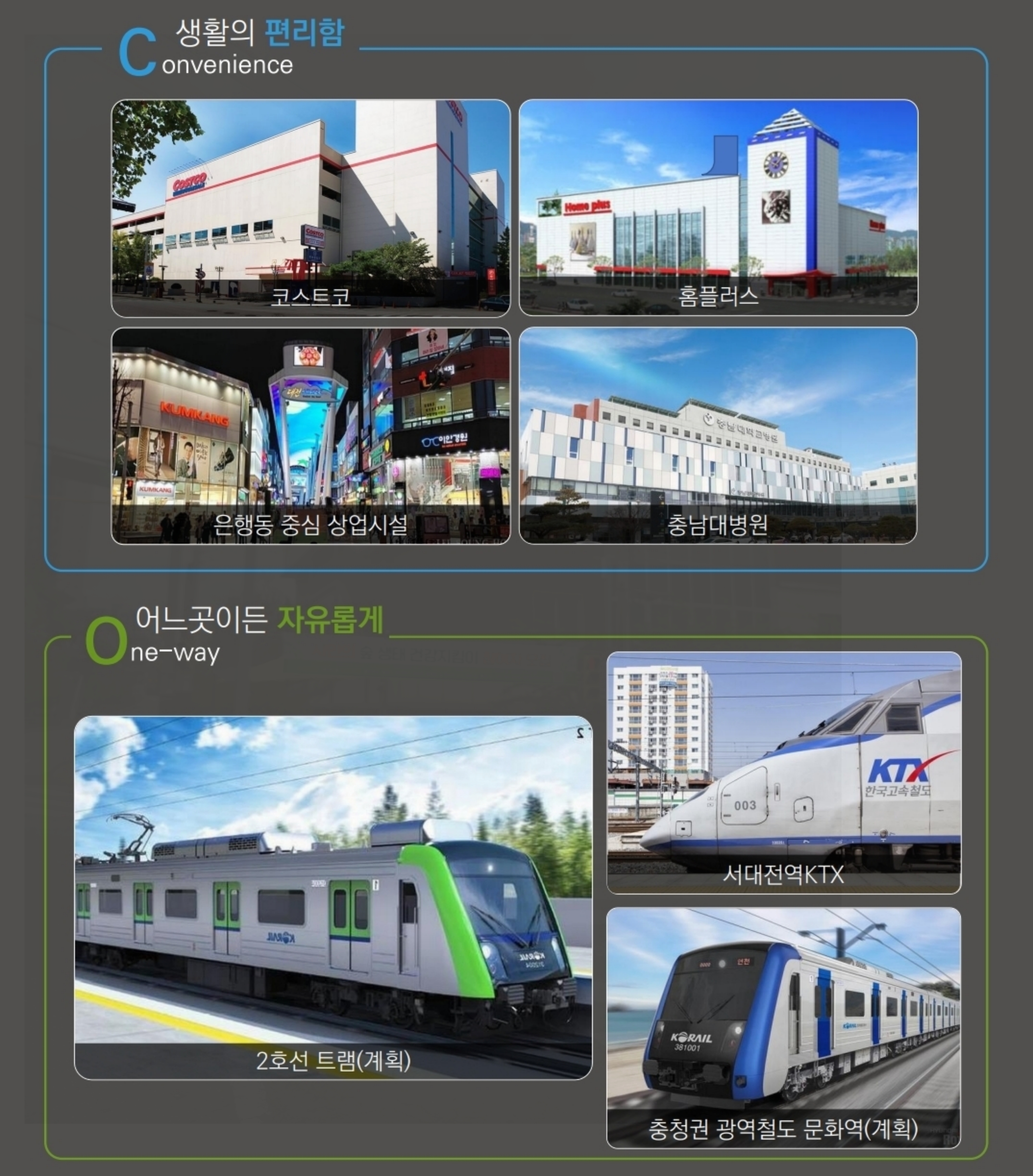 교통 접근성 또한 뛰어납니다. 충청권 광역철도 문화역(계획)과 대전 도시철도 2호선 트램(계획)이 예정되어 있어 대중교통 이용이 더욱 편리해질 전망입니다.