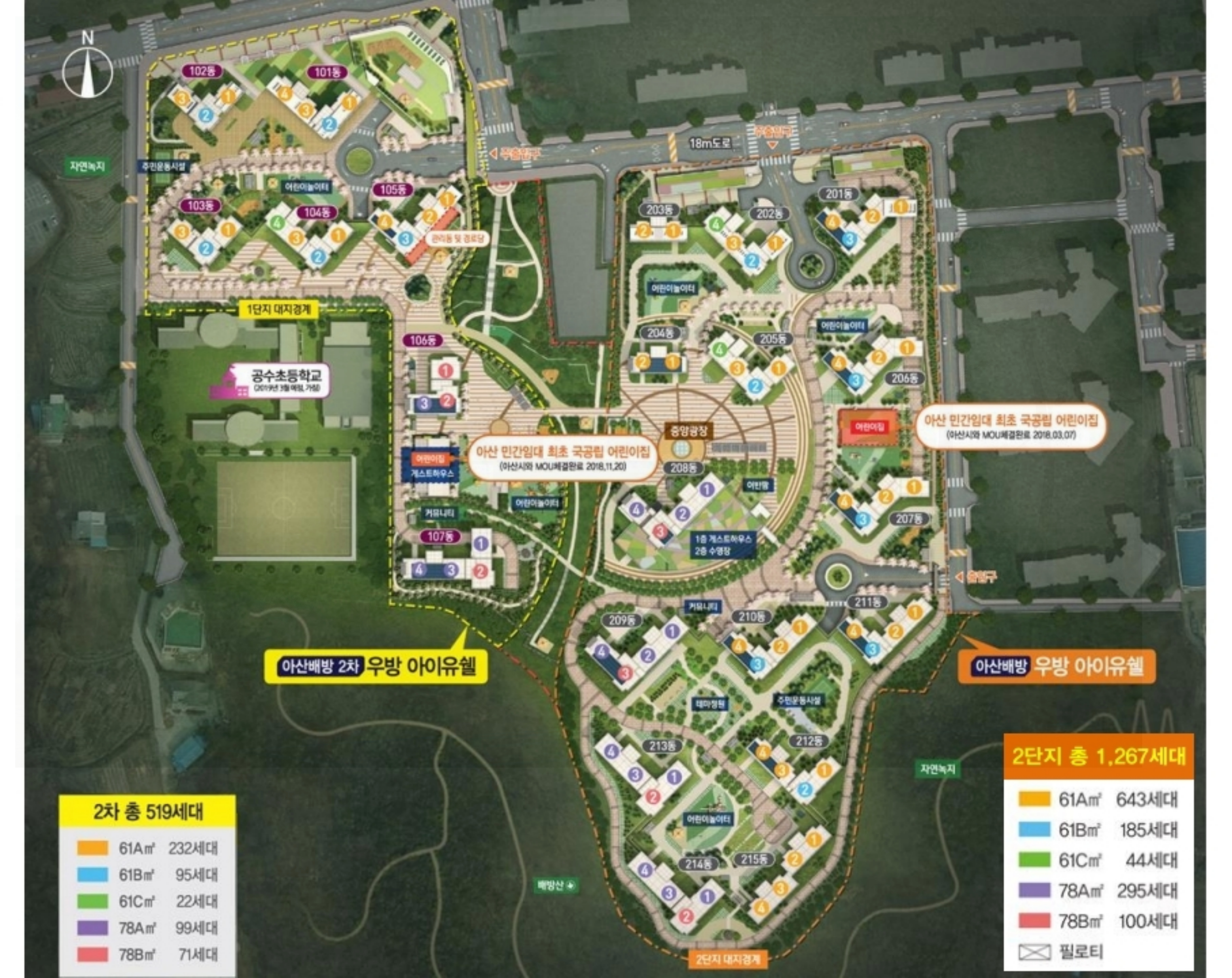 아산 배방 우방아이유쉘 2단지는 배방읍 공수리 일원에 조성되었으며, 총 2개 단지로 이루어져 있습니다.