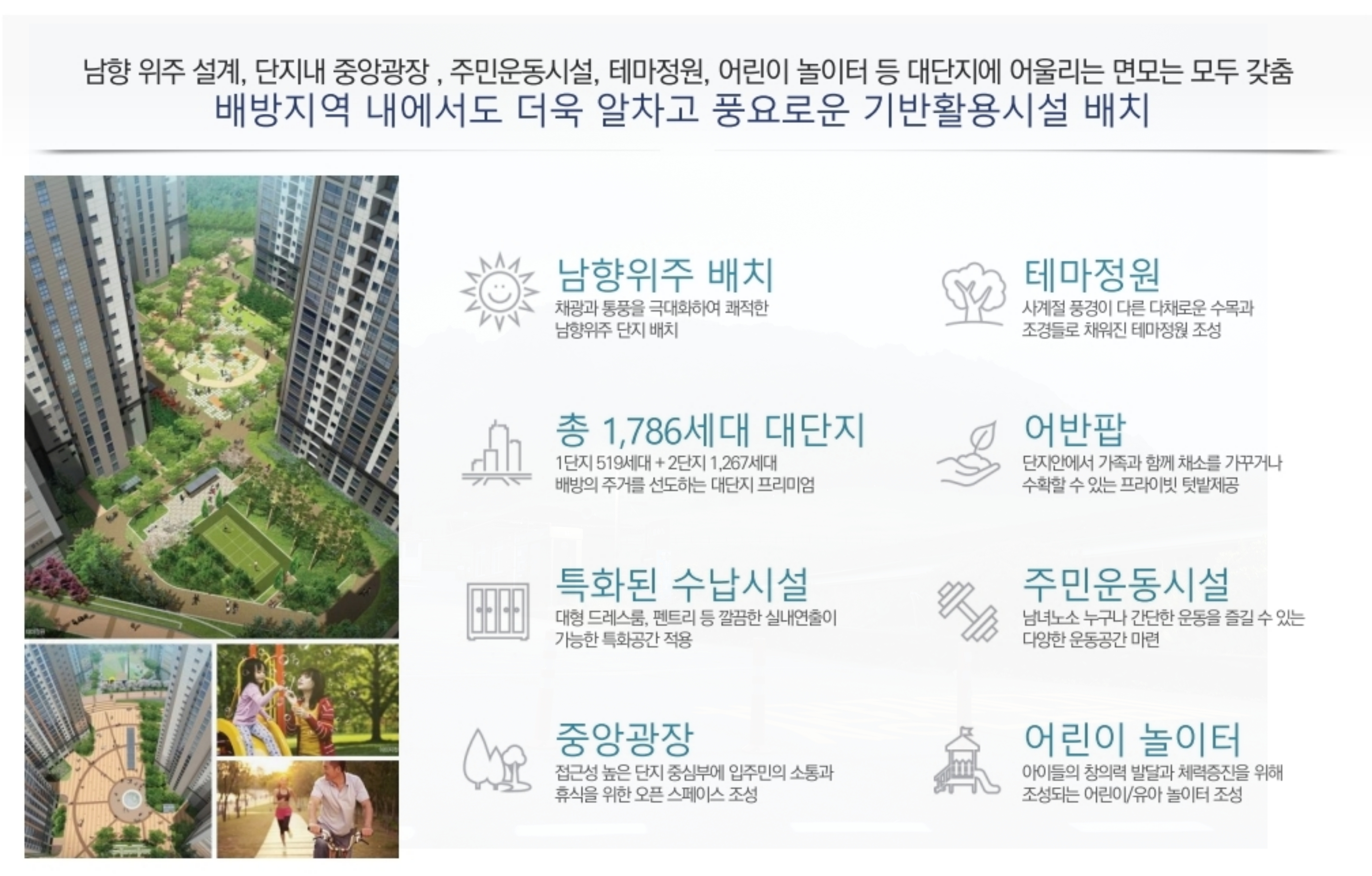 사계절 다른 풍경을 선사하는 다채로운 수목과 조경은 물론, 중앙광장, 주민운동시설, 테마정원, 어린이 놀이터 등 단지 안에서 가족과 함께 충분히 휴식하고 여가를 즐길 수 있는 공간들이 마련되어 있습니다.