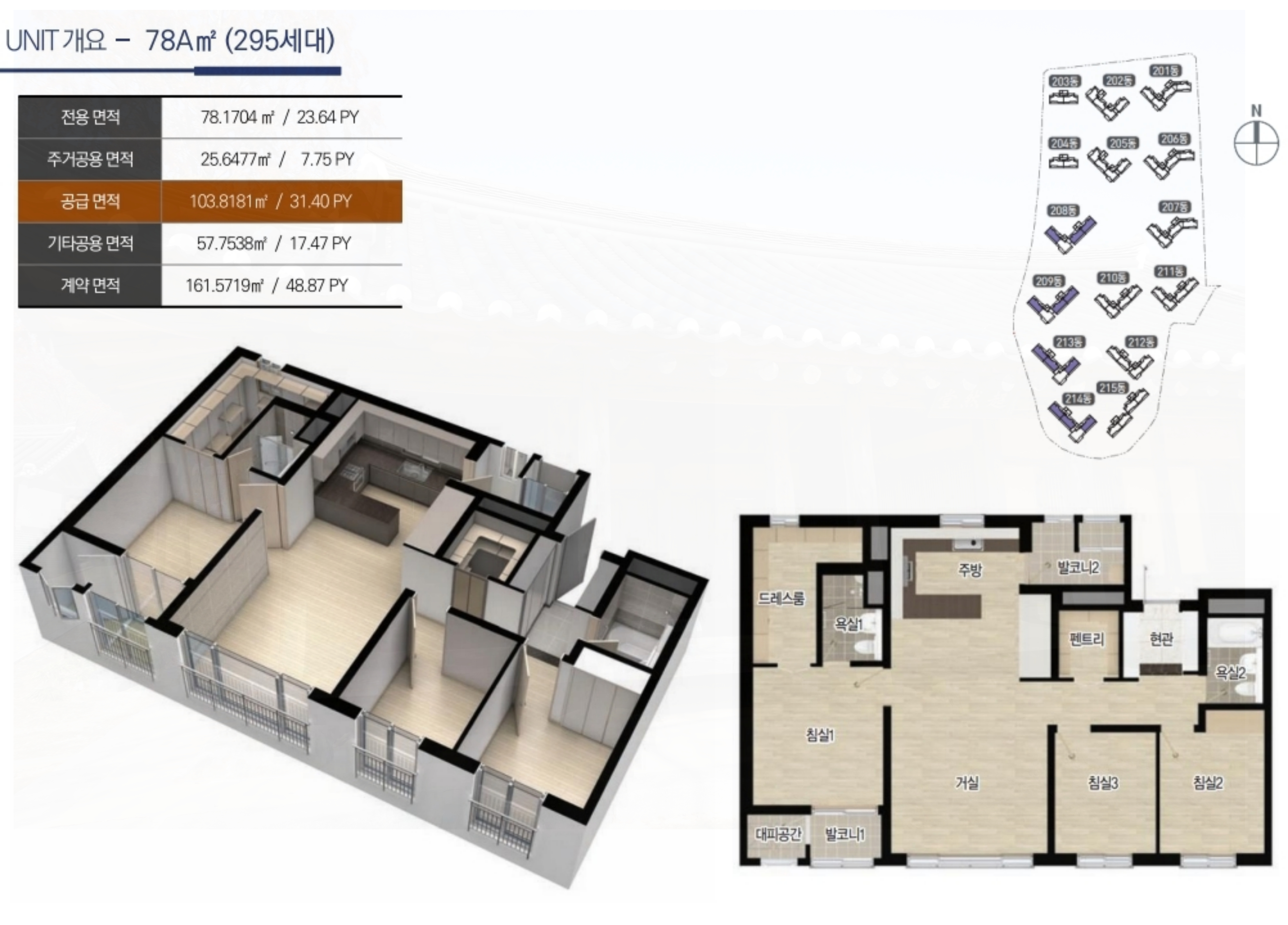 78㎡ 타입: 61㎡ 타입과 동일한 구성을 가지면서도 각 공간의 사이즈가 확장되어 더욱 여유로운 생활이 가능합니다.
