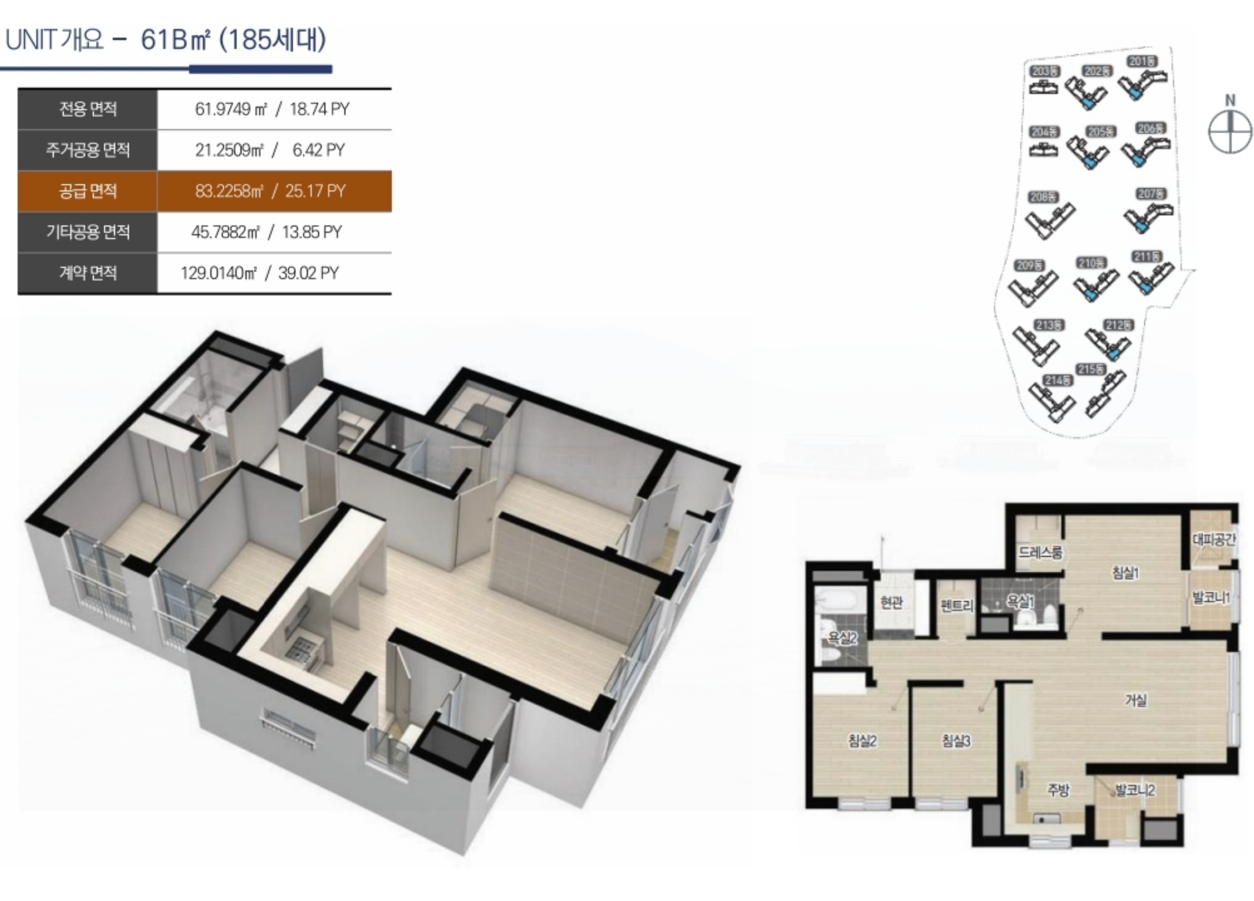 61㎡ 타입: 기본 방 3개, 거실, 욕실 2개, 주방, 복도 펜트리, 안방 드레스룸으로 구성되어 있으며, 실용적인 공간 활용이 돋보입니다.