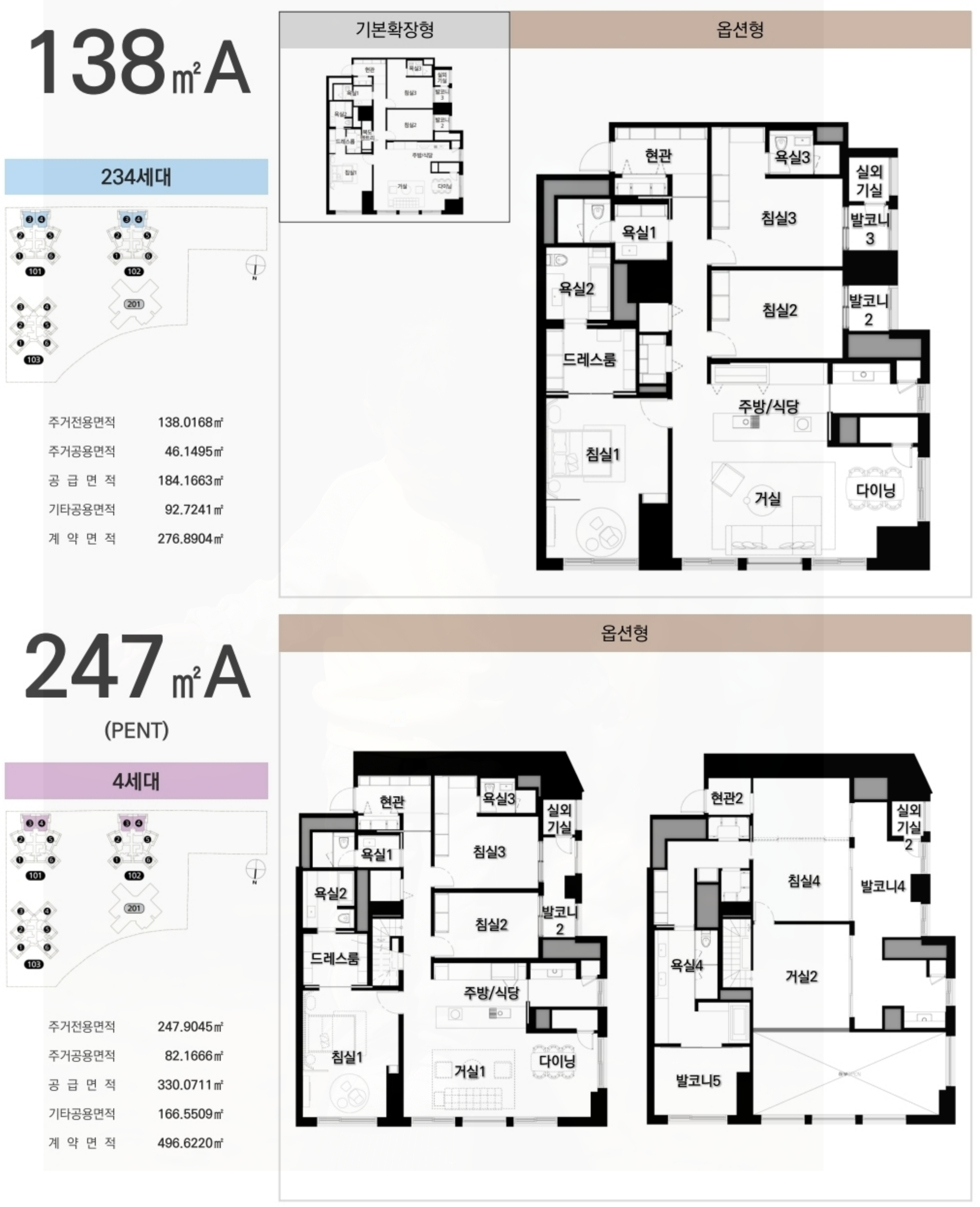 아파트는 전용면적 94㎡, 116㎡, 117㎡A, B, 130㎡, 138㎡, 그리고 펜트하우스인 247㎡까지 다양한 대형 평형이 준비되어 있습니다.