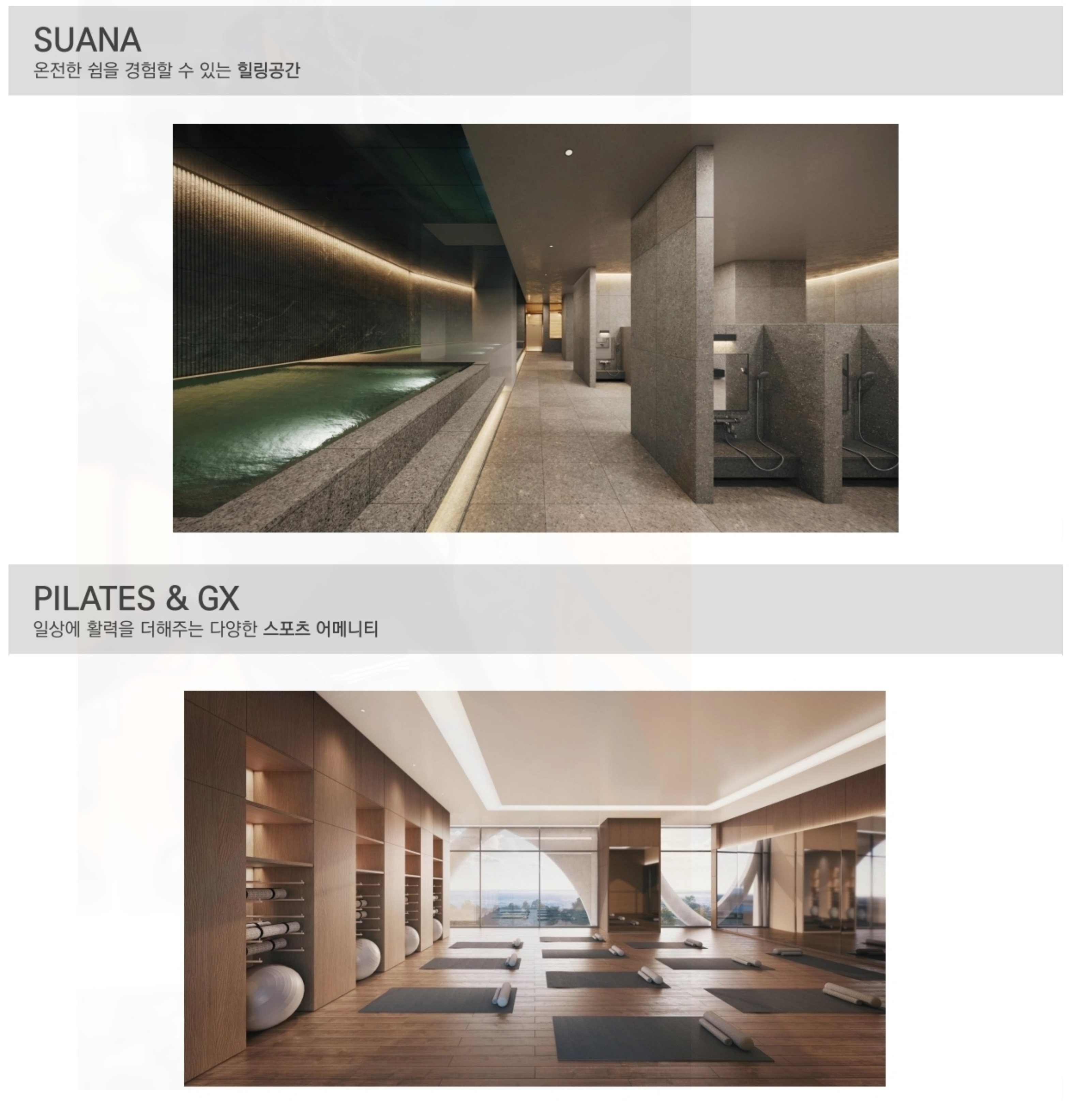 커뮤니티 시설로는 프라이빗 골프클럽, 피트니스, 필라테스, GX룸 등 다양한 운동 시설이 마련되어 있는데요.