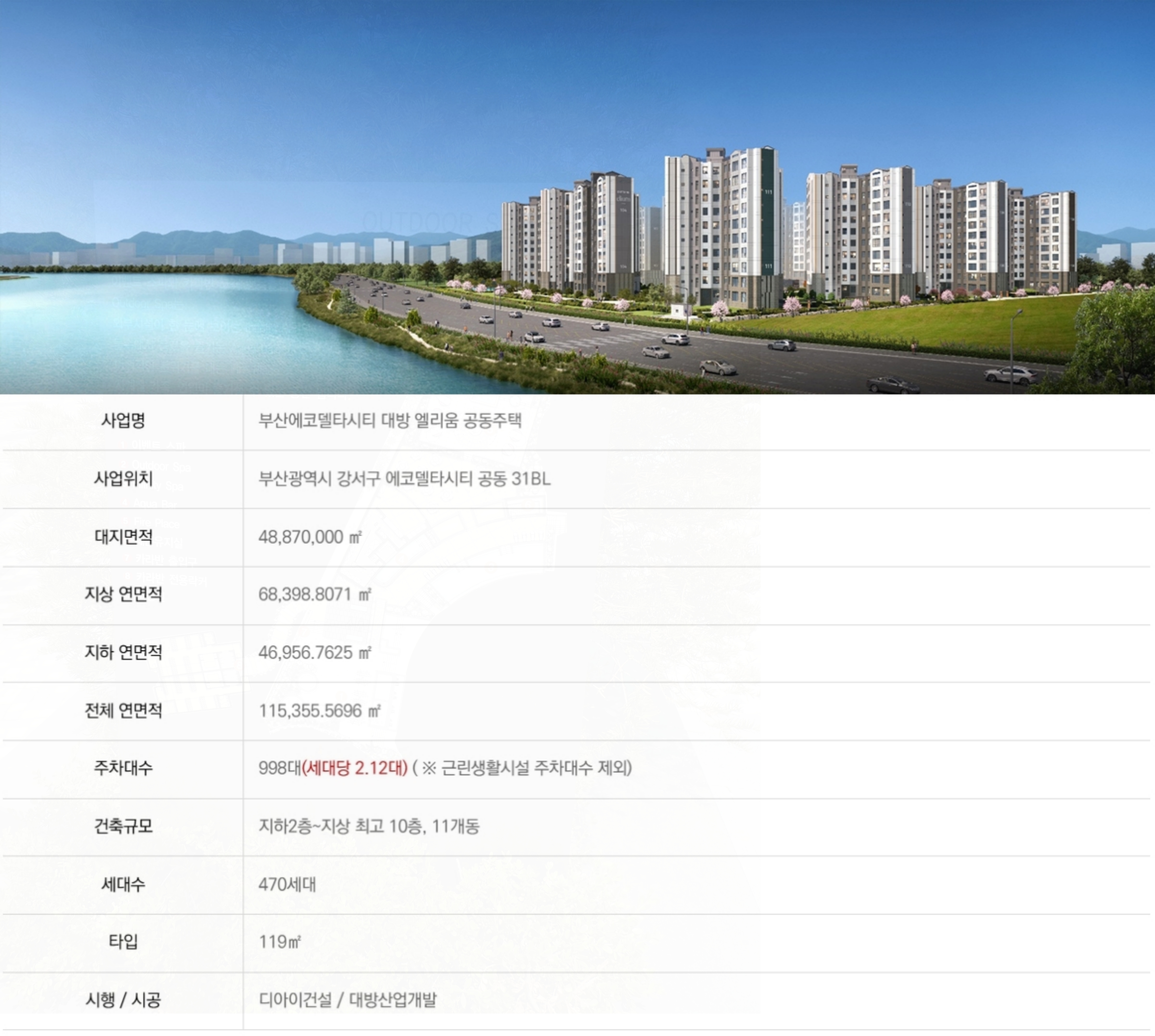 디아이 건설에서 시행하고, 대방산업개발이 시공하는 에코델타시티 대방 엘리움 아파트 이야기입니다.