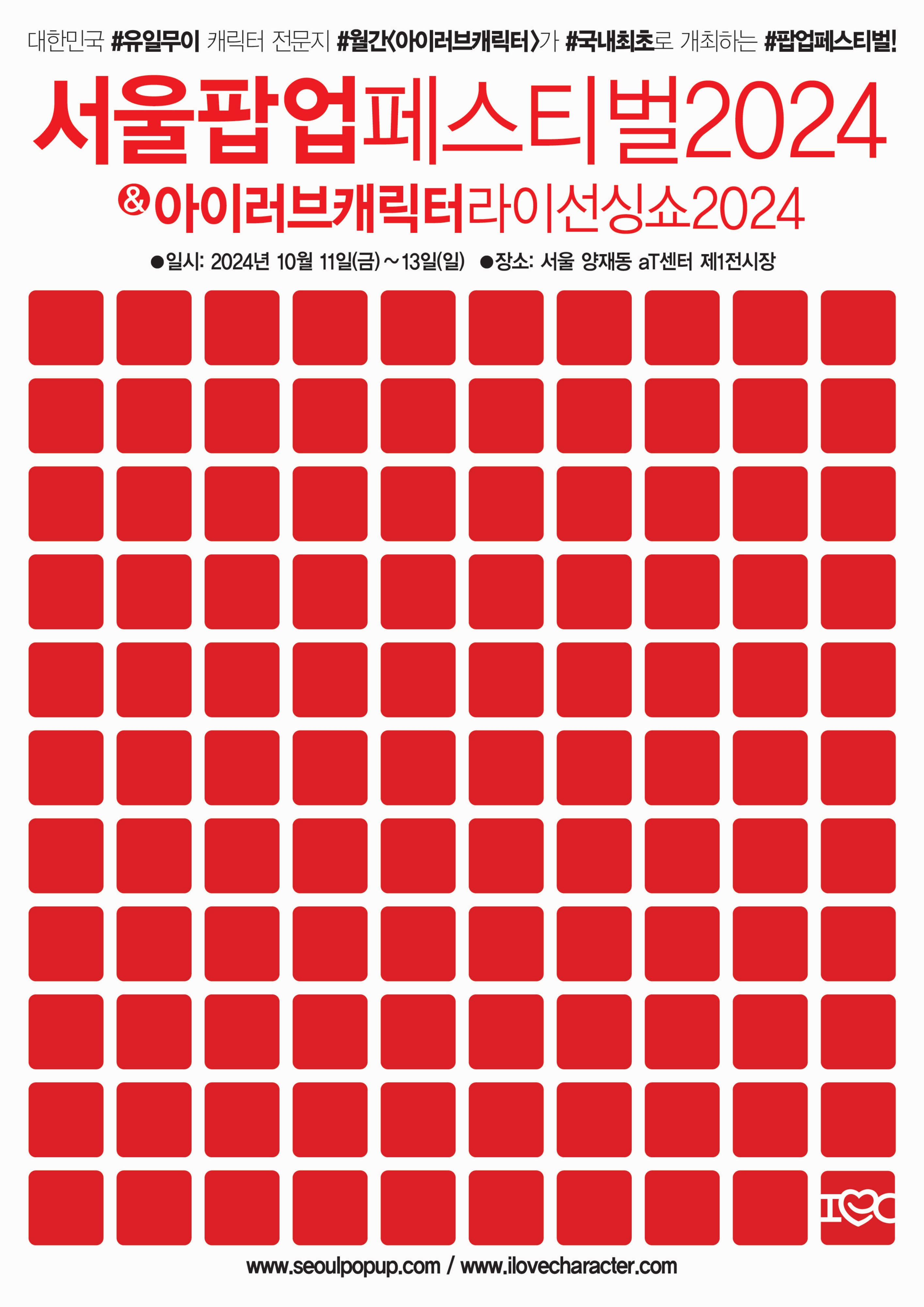 월간 아이러브캐릭터는 인기 캐릭터와 유망 IP의 팝업스토어를 만나볼 수 있는 서울팝업페스티벌2024(이하 서울팝페)를 오는 10월 11일부터 13일까지 서울시 서초구 aT센터 제1전시장에서 개최한다고 밝혔다.