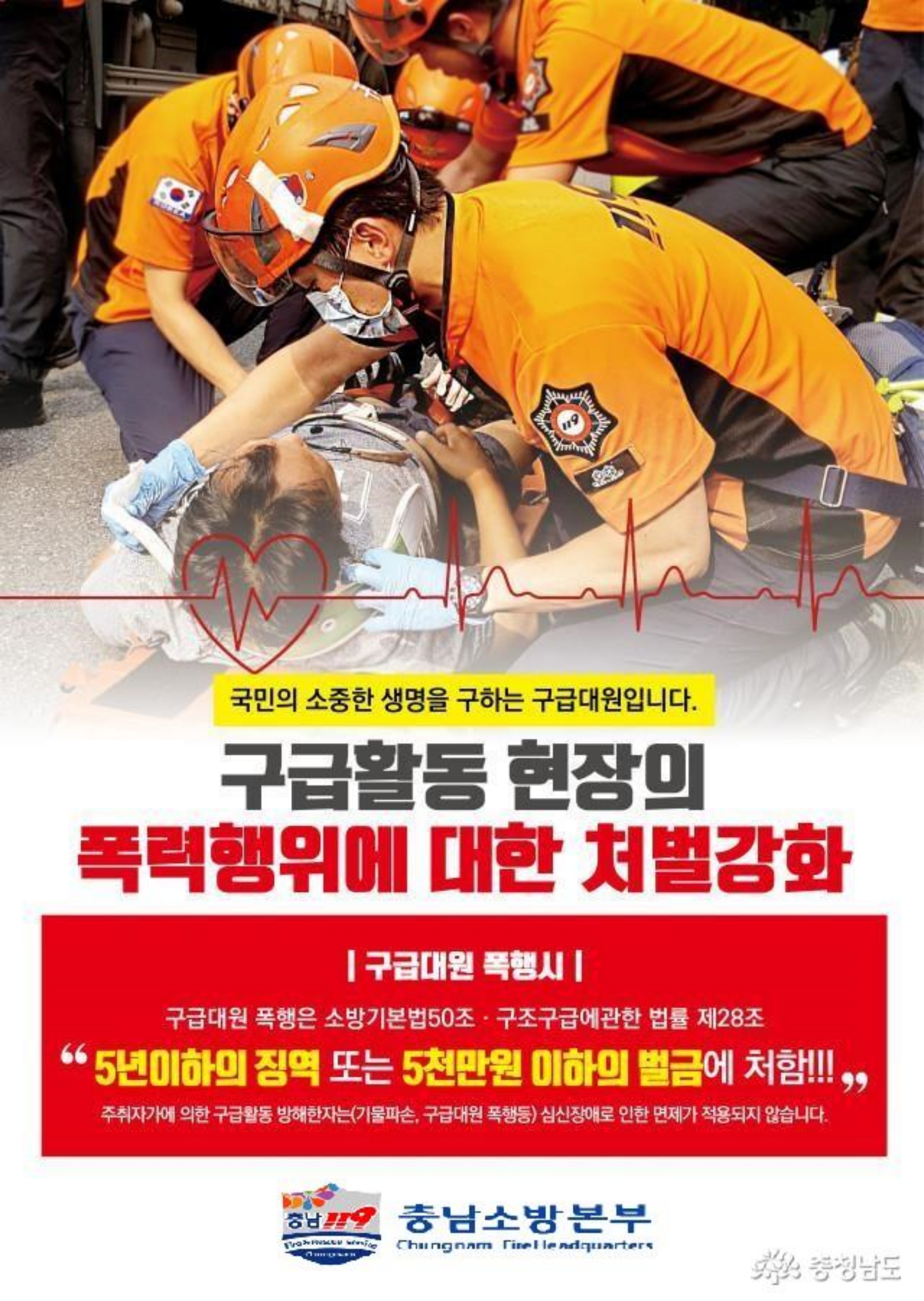 충청남도 소방본부는 최근 발생한 소방대원 폭행사건과 관련 무관용 원칙에 따라 강력 대응한다고 16일 밝혔다.