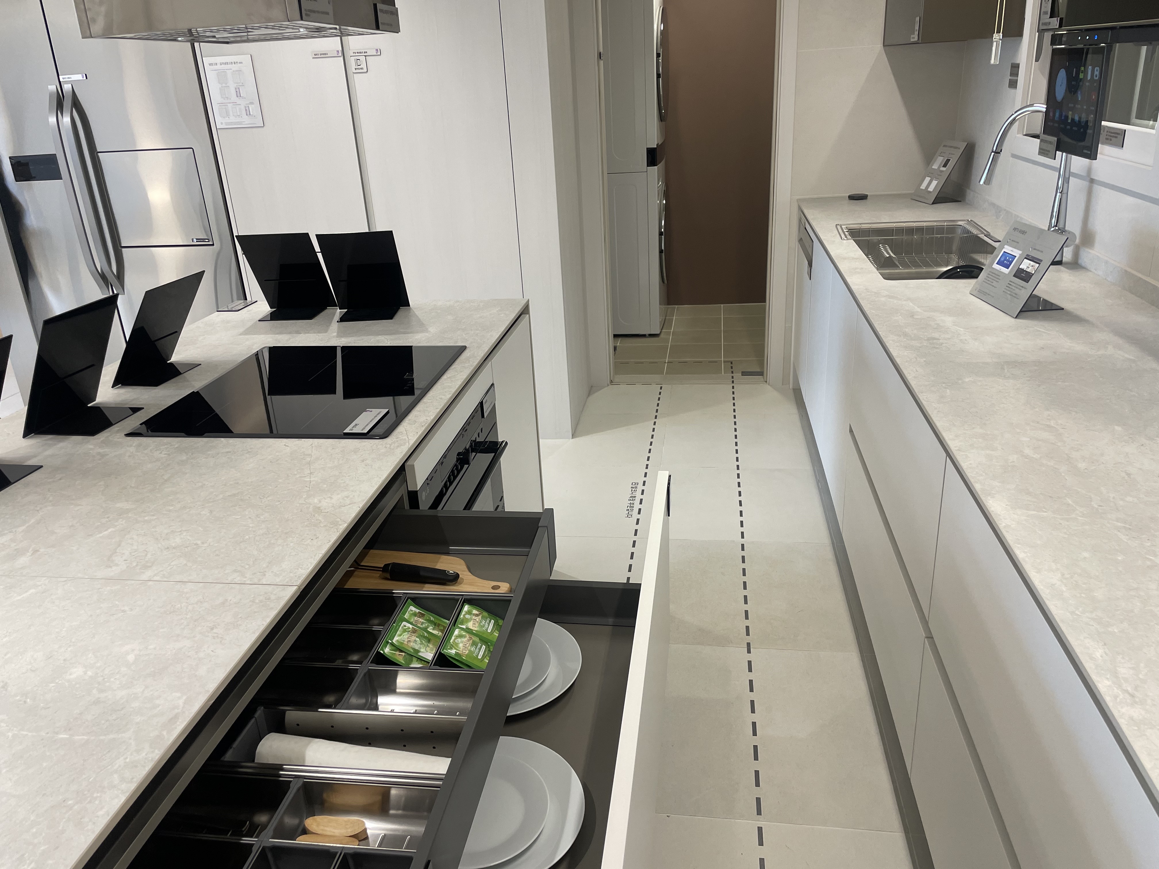 와이드 한 디귿자 구조의 주방은 이동 동선뿐만 아니라 조리 및 수납 등 여러 가지 부분에서 일상생활에 효율적인 활동에 강점을 가지고 있다고 합니다.